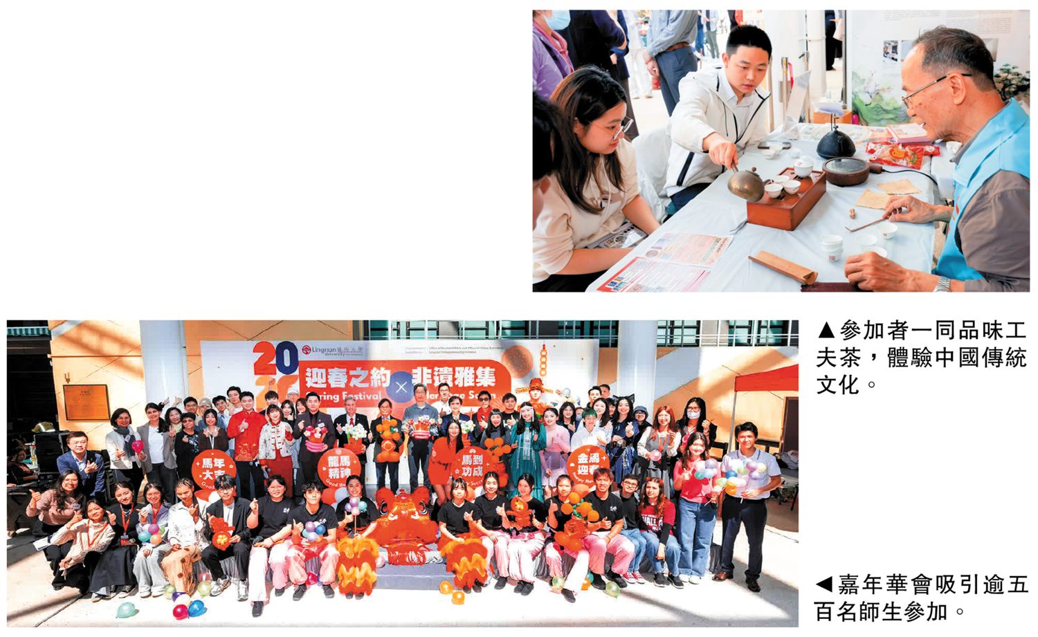 【大公報訊】為迎接丙午馬年,嶺南大學(嶺大)於2月11日在校園乾新坊(天幕)舉行由學生事務處與環球教育處合辦的「迎春之約×非遺雅集」嘉年華,吸引逾500名師生聚首一堂,在非物質文化遺產的展示與節慶氛圍中共慶新春。