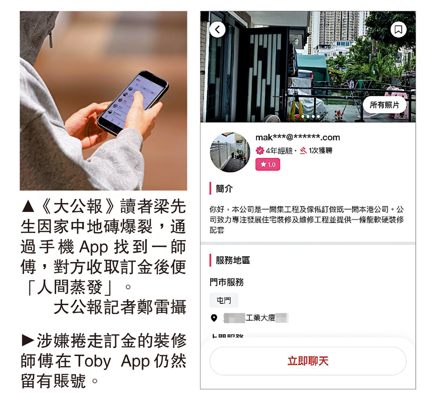 《大公報》讀者梁先生於去年底家中地磚爆裂,通過Toby App找到名叫顧×康的師傅,對方收取8000元訂金後便「人間蒸發」,到現在亦仍未能成功追討。梁先生表示,看到新聞上的裝修糾紛,似乎大多數都是未能追討成功,梁先生認為香港的裝修申訴流程看似完善,實則真正出事了卻似乎難以發揮效用。