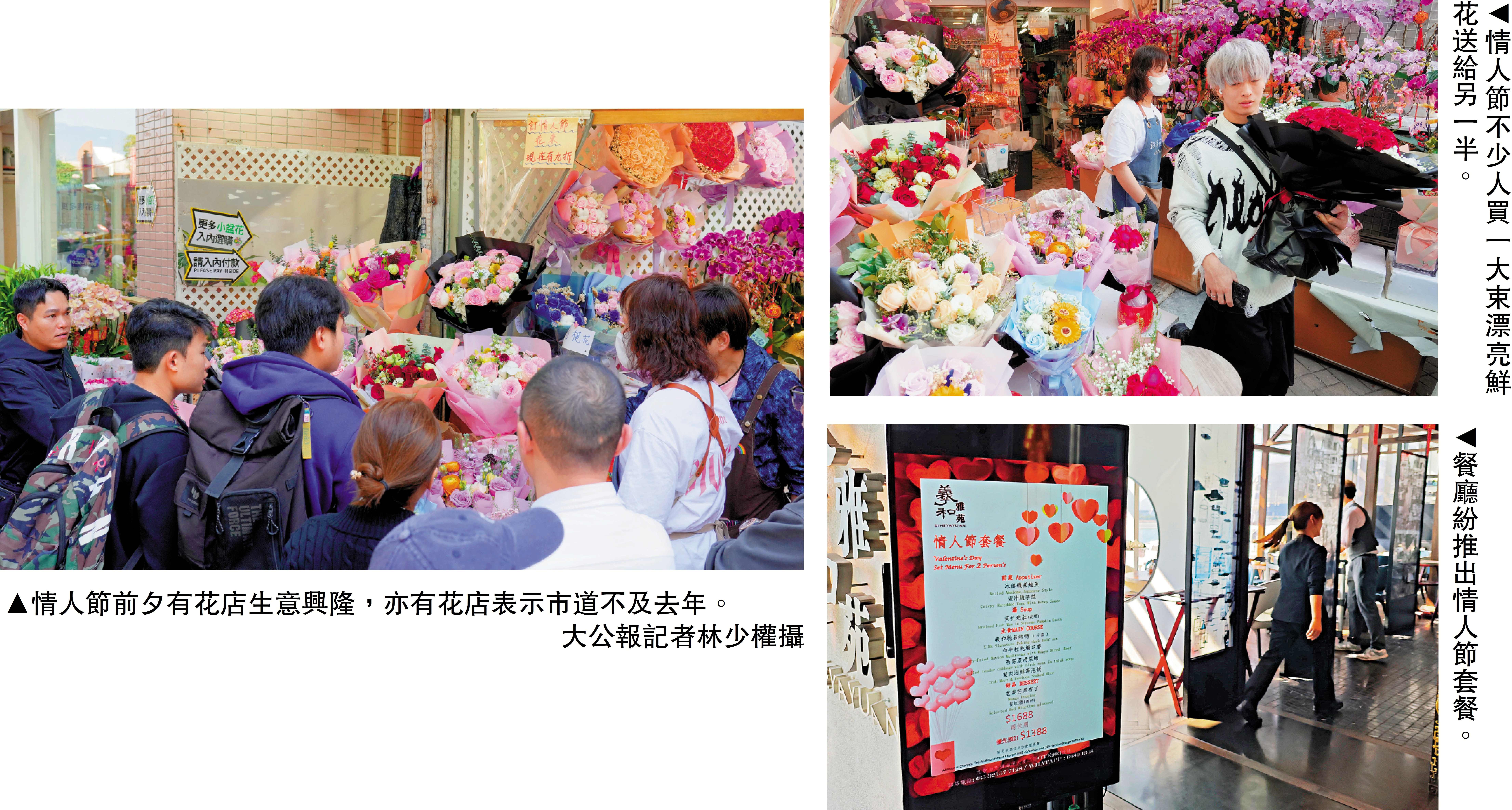 在銅鑼灣維園年宵市場,多個花檔除了售賣年花,趁着情人節作特別布置吸引顧客,爭相推出優惠,以「開心價」作招徠,各式各樣的玫瑰、五彩斑斕繡球花、繽紛的滿天星花束,一束180至220元不等。不過有花檔職員稱,今年人流較差,銷情未似預期,「好靜,靜過去年」。她又說今年花價與往年相若,不敢加價。