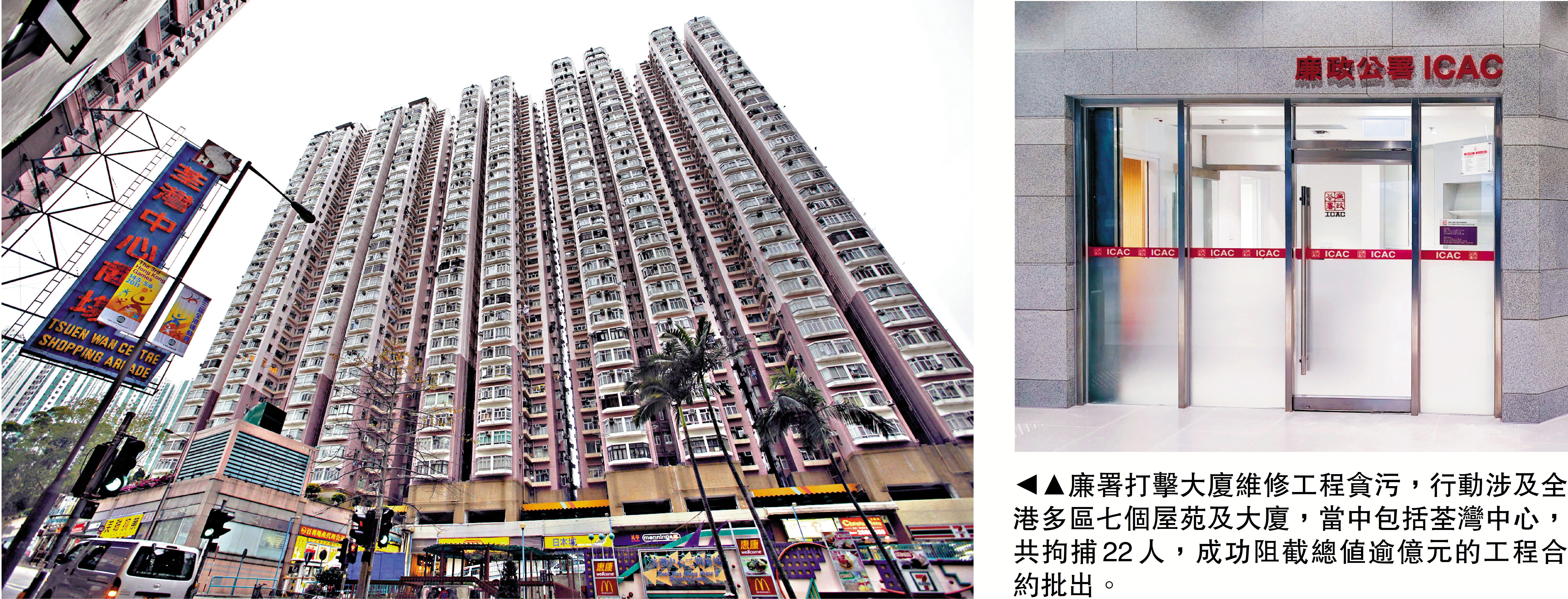 位於荃景圍的荃灣中心有19座,最早一期1979年入伙,維修工程仍在籌備階段。廉署人員在行動中根據法庭手令搜查了多個地點,包括涉案工程顧問公司及工程承辦商的辦公室,檢走多項證物,包括相關大維修工程的招標和工程文件,以及銀行和會計紀錄。