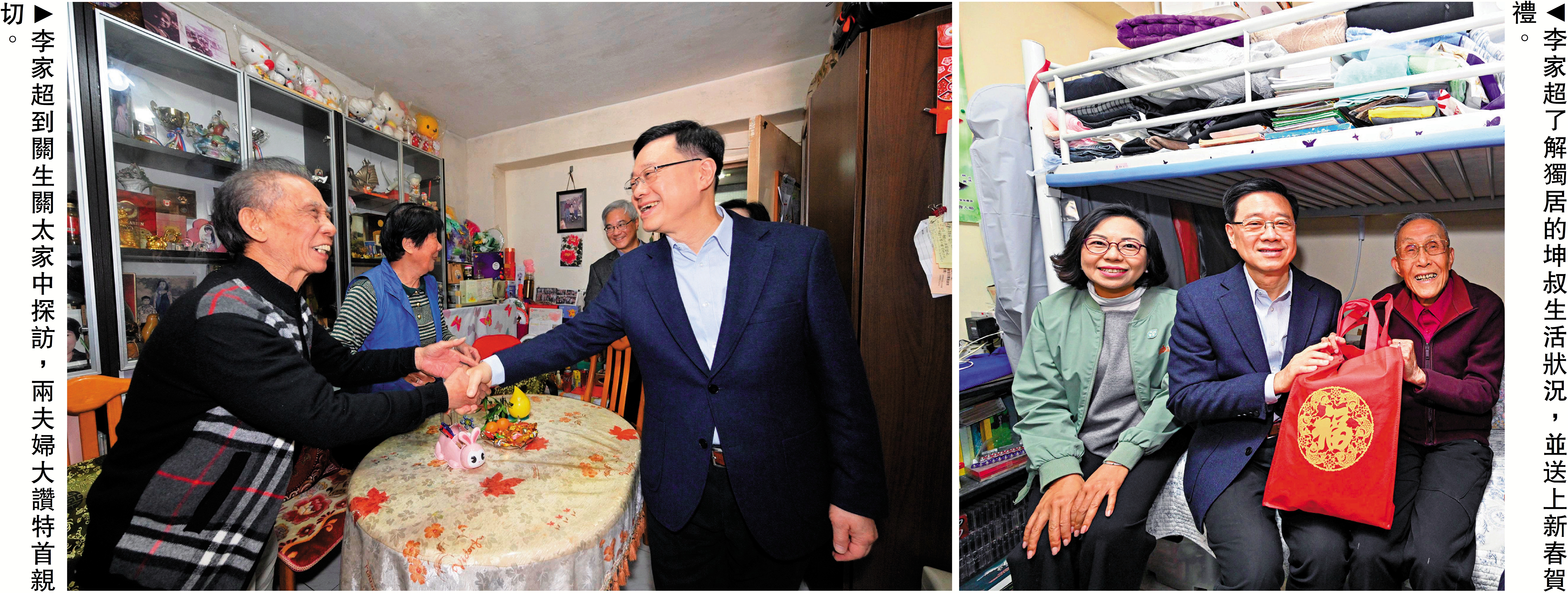 行政長官李家超昨日落區到油麻地,探訪房協轄下駿發花園的長者住戶,並到長者服務中心了解街坊生活情況、送贈賀年福袋。一對八旬退休夫婦向李家超表示,「全世界最好的地方就是香港」,並大讚特首關心長者;一名93歲老伯現時仍有做義工,他希望特首「帶領香港乘風破浪」。