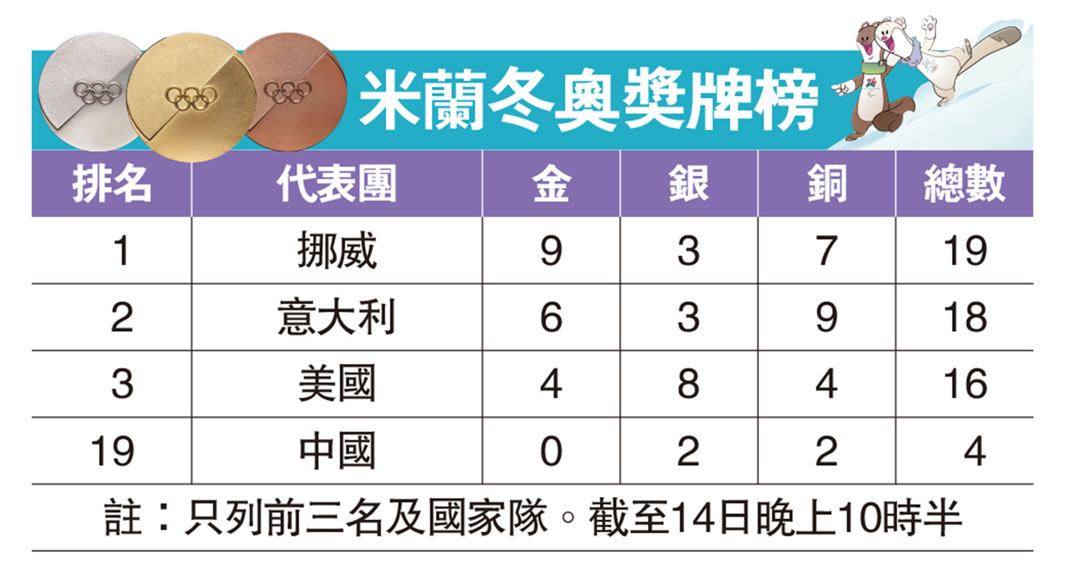 圖:米蘭冬奧獎牌榜