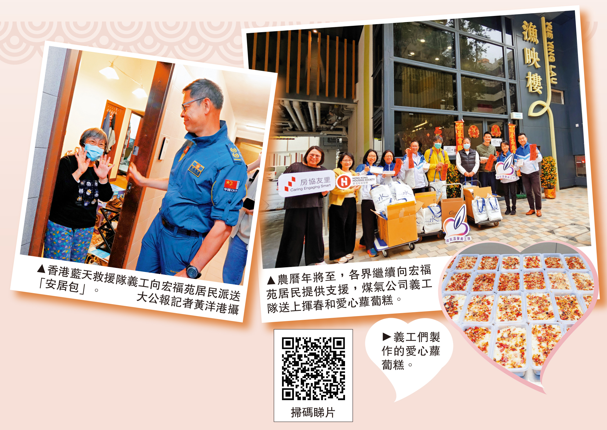 年廿六這天,香港藍天救援隊義工向在大埔區安置的十幾戶宏福苑居民派發「安居包」。記者現場見到,有居民開門等候義工,在義工逐一搬運、介紹電器時,居民向他們逐一道謝;道別時,大家互相祝福「新年快樂,身體健康」,暖意洋洋。這些電器許多是由內地不同的企業捐贈,如微博、騰訊、美的等,再由藍天救援隊按網上登記名單逐戶聯繫、配送。