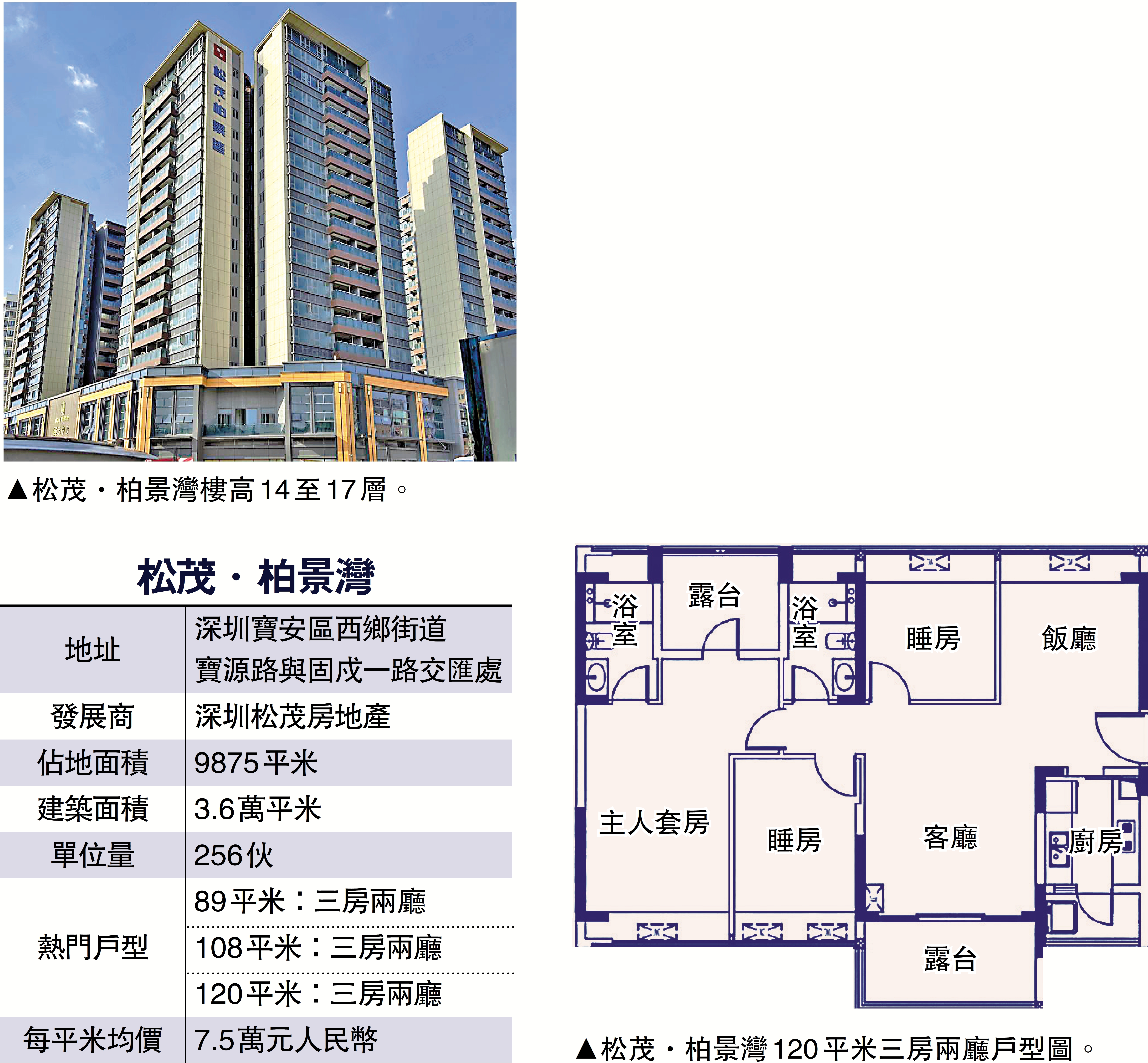 在家坐擁西灣紅樹林公園海景,出門面對城中村舊改挑戰,松茂‧柏景灣詮釋了深圳樓市的矛盾與機遇。樓盤定位為輕奢海景花園社區,由5座14至17層高住宅組成,共256伙,主打單位面積89至120平米,戶型南北通透,追求空間利用效率與景觀視野最大化。