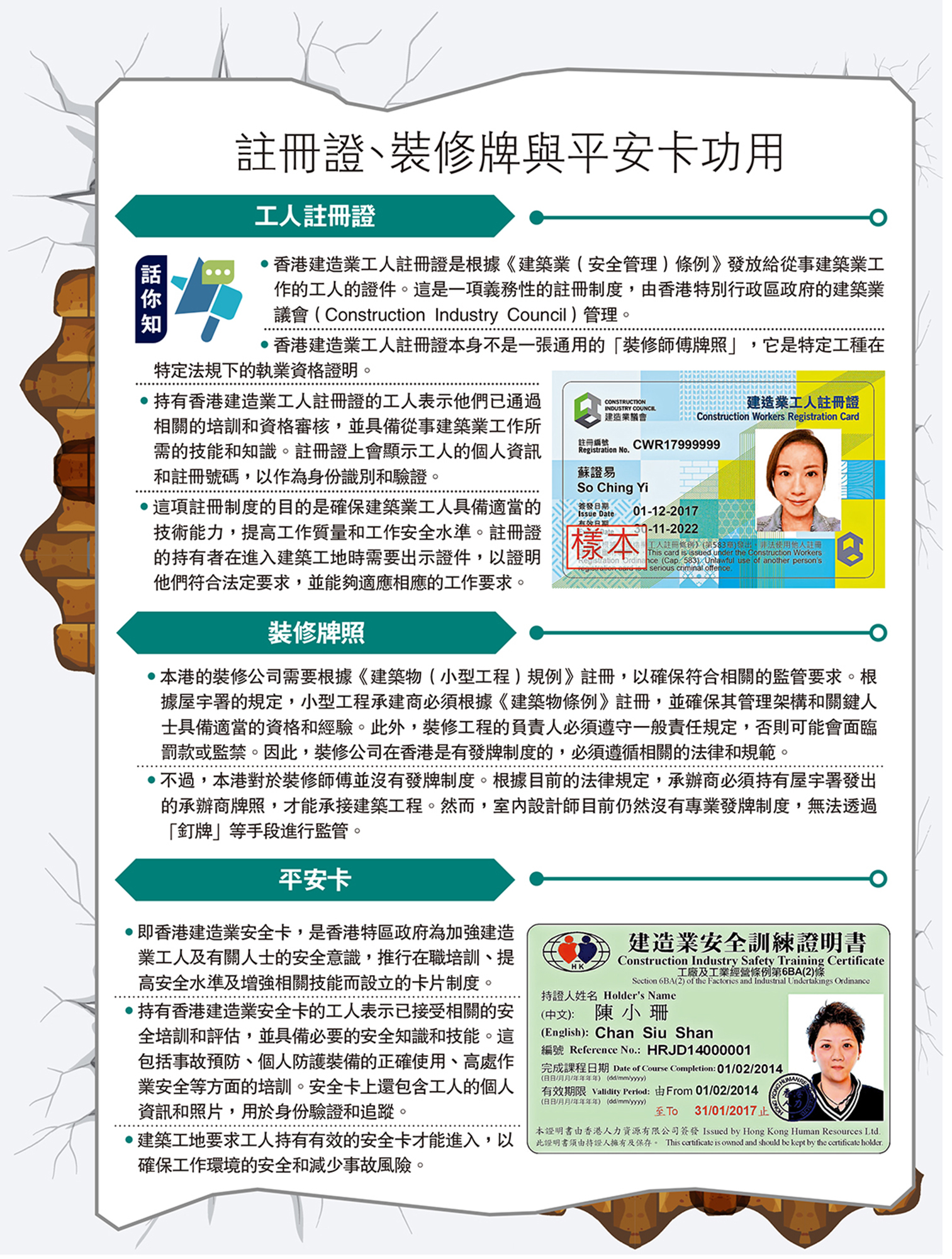 •這項註冊制度的目的是確保建築業工人具備適當的技術能力,提高工作質量和工作安全水準。註冊證的持有者在進入建築工地時需要出示證件,以證明他們符合法定要求,並能夠適應相應的工作要求。