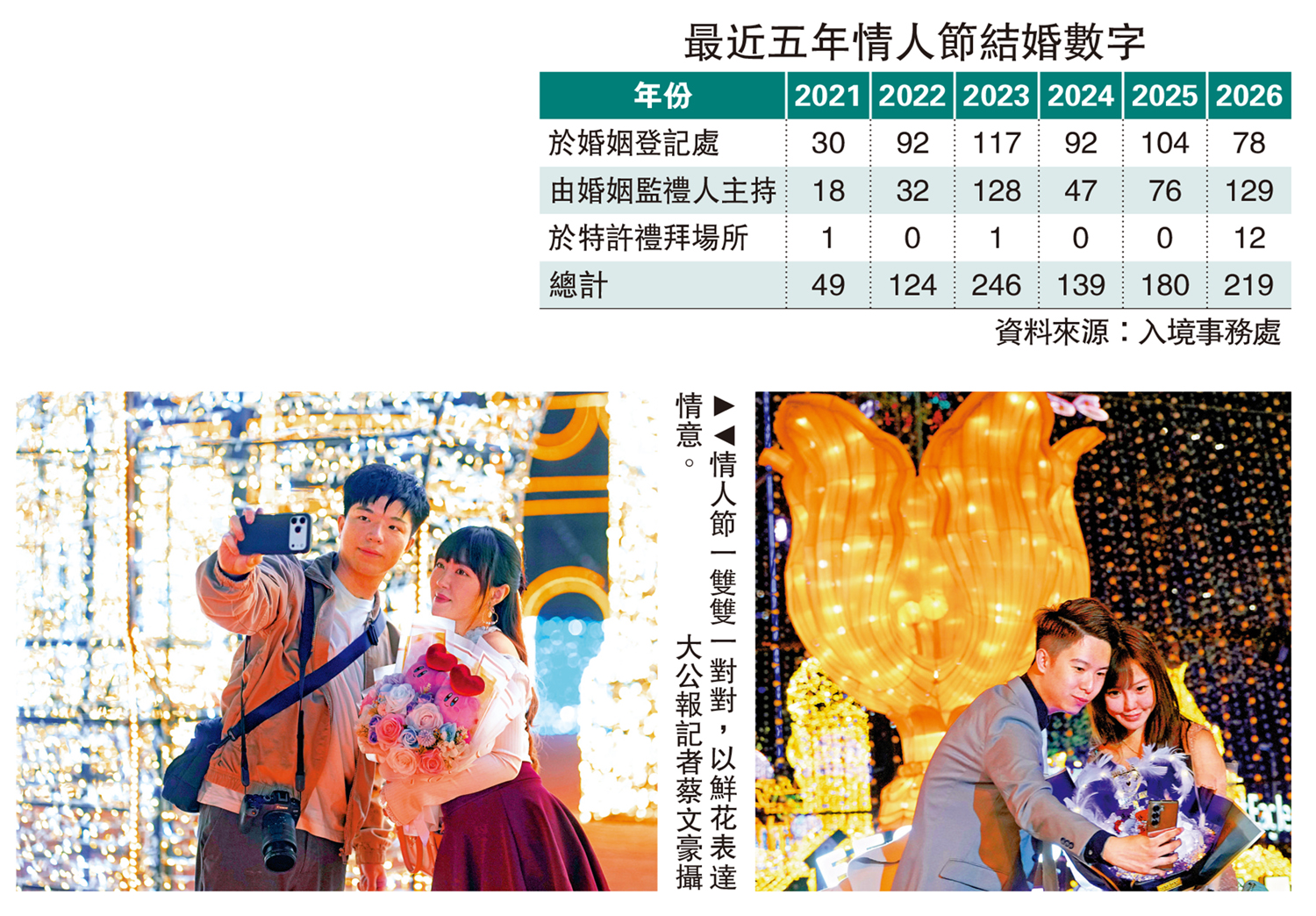 昨日是情人節,入境事務處數據顯示,有219對情侶在這天「拉埋天窗」,登記結婚數字較去年情人節上升逾兩成,並創下近三年新高紀錄;當中由婚姻監禮人主持婚禮的佔六成(129宗),創六年來新高。