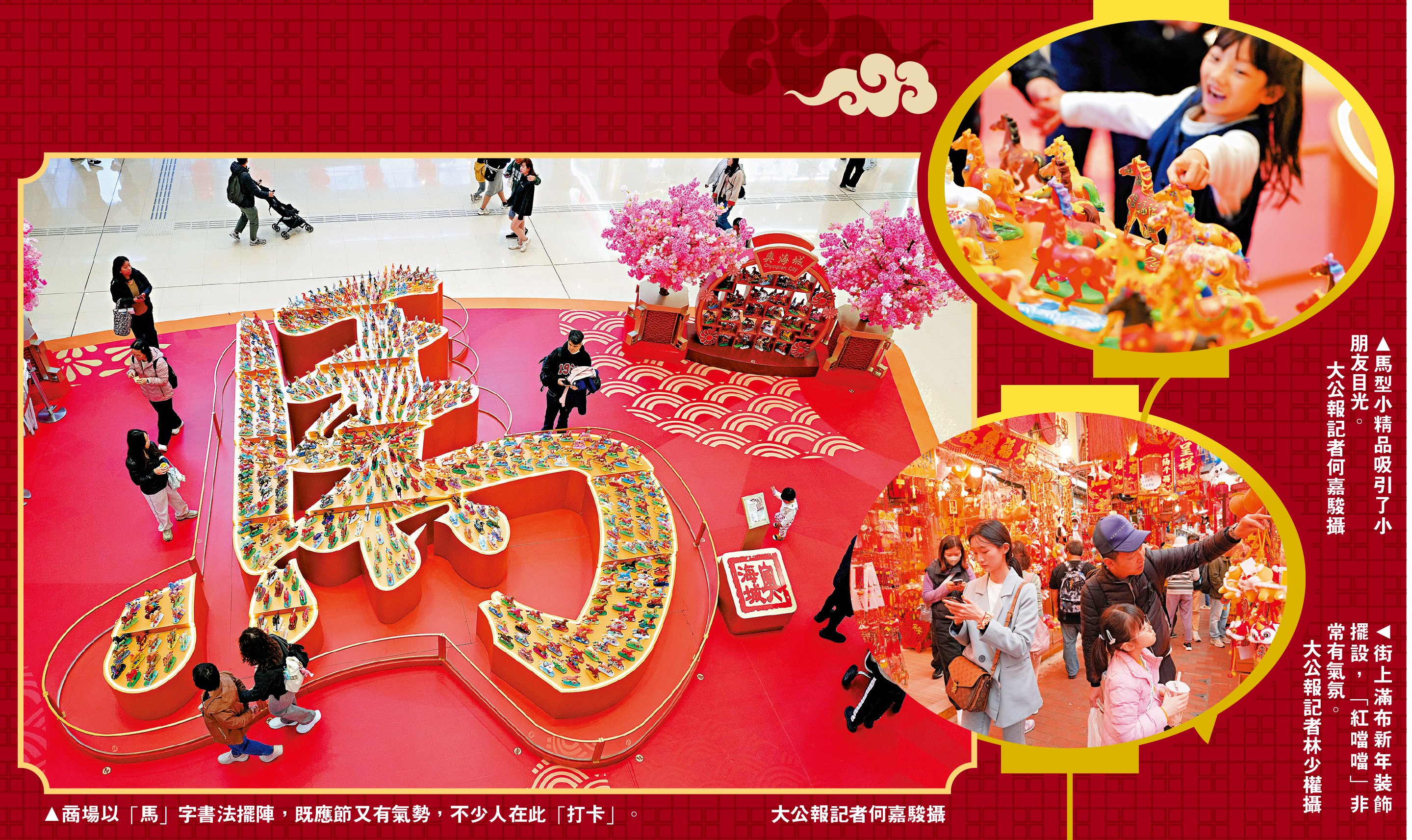 今日是農曆年廿八,還有兩天便到丙午馬年,歲晚香港市面非常熱鬧,家家戶戶送舊喜迎新春,許多市民紛紛湧上街辦年貨。春節是消費黃金檔期,很多店舖都推出各式各樣優惠,催谷消費,大型商場特別設計新年擺設裝飾,當然以「馬」為主題應節最為吸引,有些是中西合璧,為傳統增添新意,充滿繽紛歡樂氣氛。不少市民前來拍照「打卡」,順道買心頭好,滿載而歸過新年。