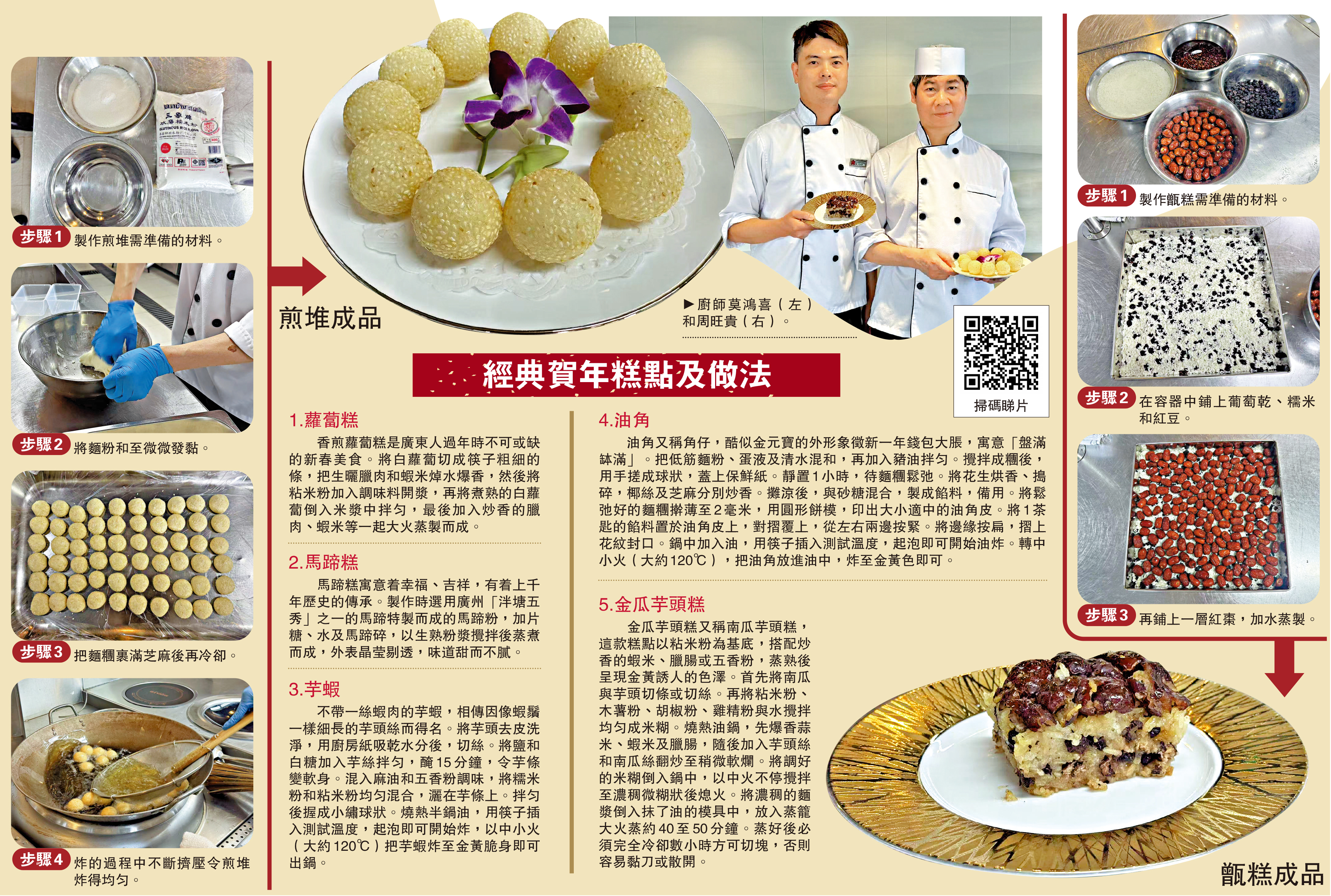 在農曆新年這個闔家團圓的節日裏,一大桌美食中必不可少的就是寓意吉祥的賀年糕點。蘿蔔糕、馬蹄糕、油角、蛋黃酥等經典糕點可為新春團圓飯錦上添花。今次大文集團食堂的廚師周旺貴和莫鴻喜分別為馬年新春準備了煎堆和陝西棗泥甑糕,兩款糕點都簡單易學,適合在家中嘗試製作。\大公報記者 顏 琨(文、圖)