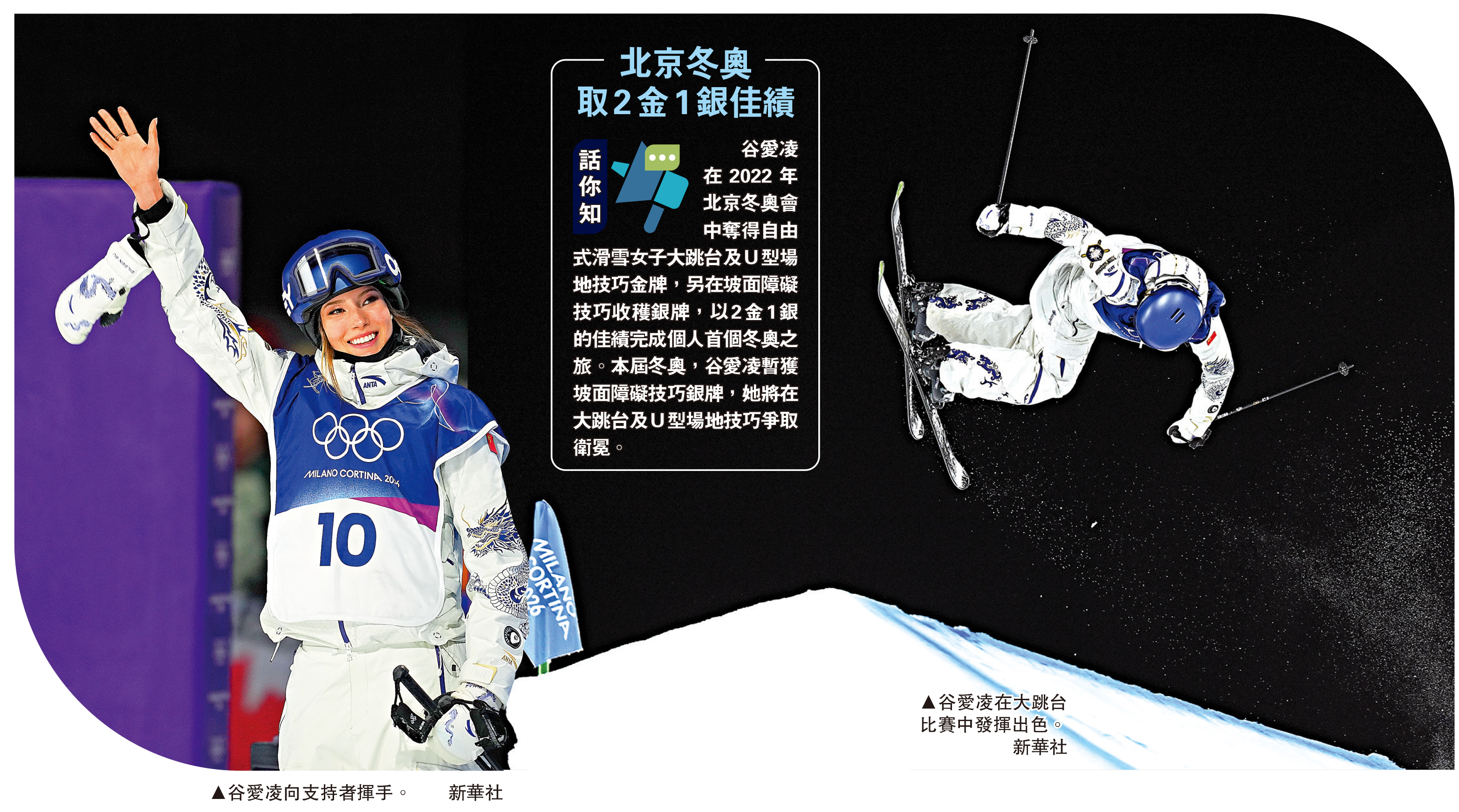 14日,米蘭冬奧會自由式滑雪女子大跳台資格賽中,爭取衛冕冠軍、中國選手谷愛凌和隊友劉夢婷鎖定決賽席位,另一中國選手楊如意無緣晉級。谷愛凌在資格賽第一個出場,首輪A組動作,右轉起跳1440抓板,落地成功,得到86分。第2跳她嘗試B組動作,左轉起跳1080抓板,但落地摔倒,僅得到20.75分。第3輪動作與第2輪相同,她順利完成,得到84.75分。