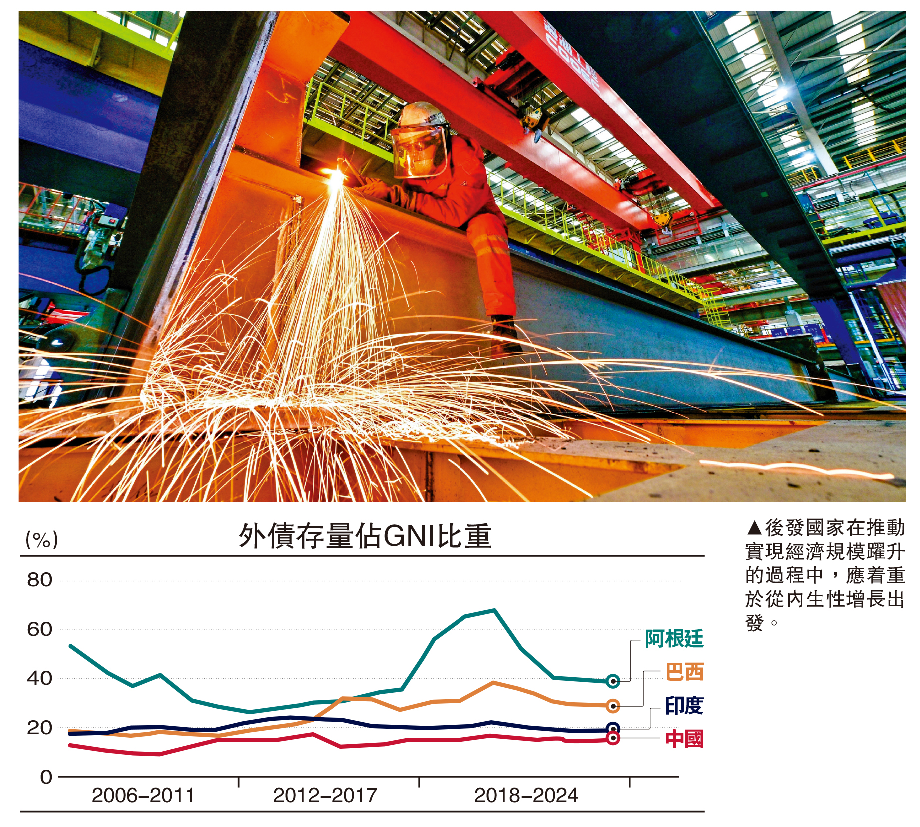 一是經濟對外依存度偏高,內生性增長動能不足。後發國家在起飛階段經濟基礎條件相對薄弱,缺乏原始積累,特別是對於原材料和能源資源為主的後發國家而言,缺乏製造業能力。部分後發國家在經濟轉軌過程中未能抓住有利時機進行自主創新,如委內瑞拉、阿根廷、智利等國家依託於豐富的資源能源出口獲得更多外匯儲備,但存在經濟發展的內生性動能明顯不足、外部性依賴又過重等問題。比如,越南外資企業的出口份額高達75%,而且對美國市場依賴性較大,對美出口佔比超過三分之一,受到美國「對等關稅」的威脅。又比如巴西、希臘,因過度依賴外部市場,累積大量外債,國際收支嚴重失衡。根據世界銀行的數據,2024年中國、印度外債存量佔國民總收入( GNI,Gross National Income)的比重為13%,巴西、阿根廷的外債比例雖逐漸呈小幅下降態勢,但目前的比重仍分別為29%和39%,明顯偏高。