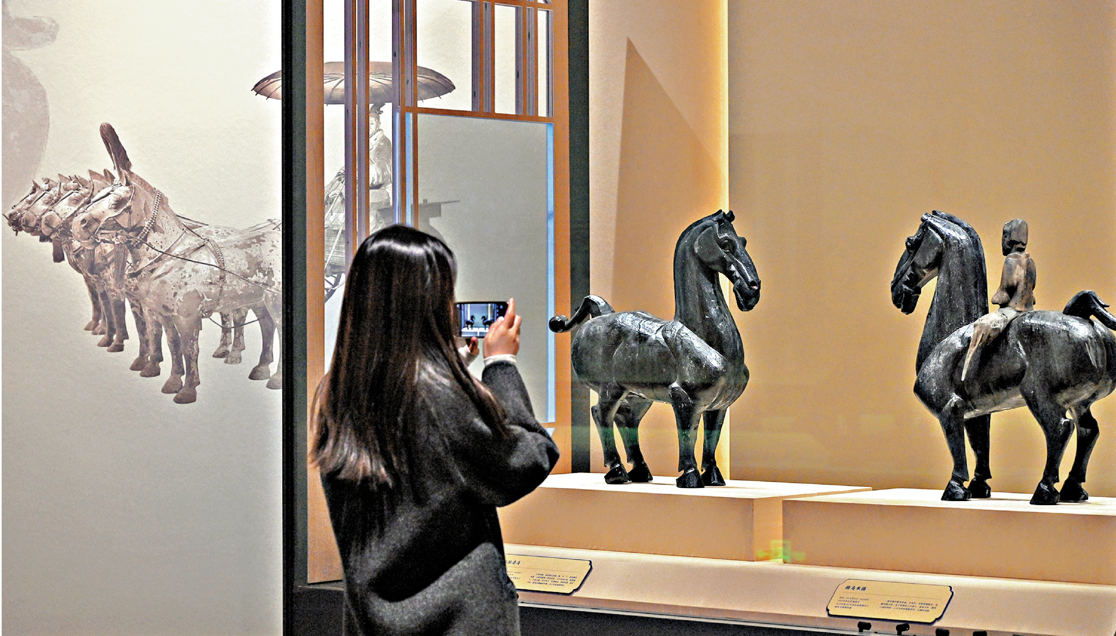 「躍馬揚鞭——馬年新春文化展」正在位於北京的中國國家博物館舉行。展覽遴選與馬相關的精品文物一百二十餘件/套。圖為展出的木胎漆馬。\新華社