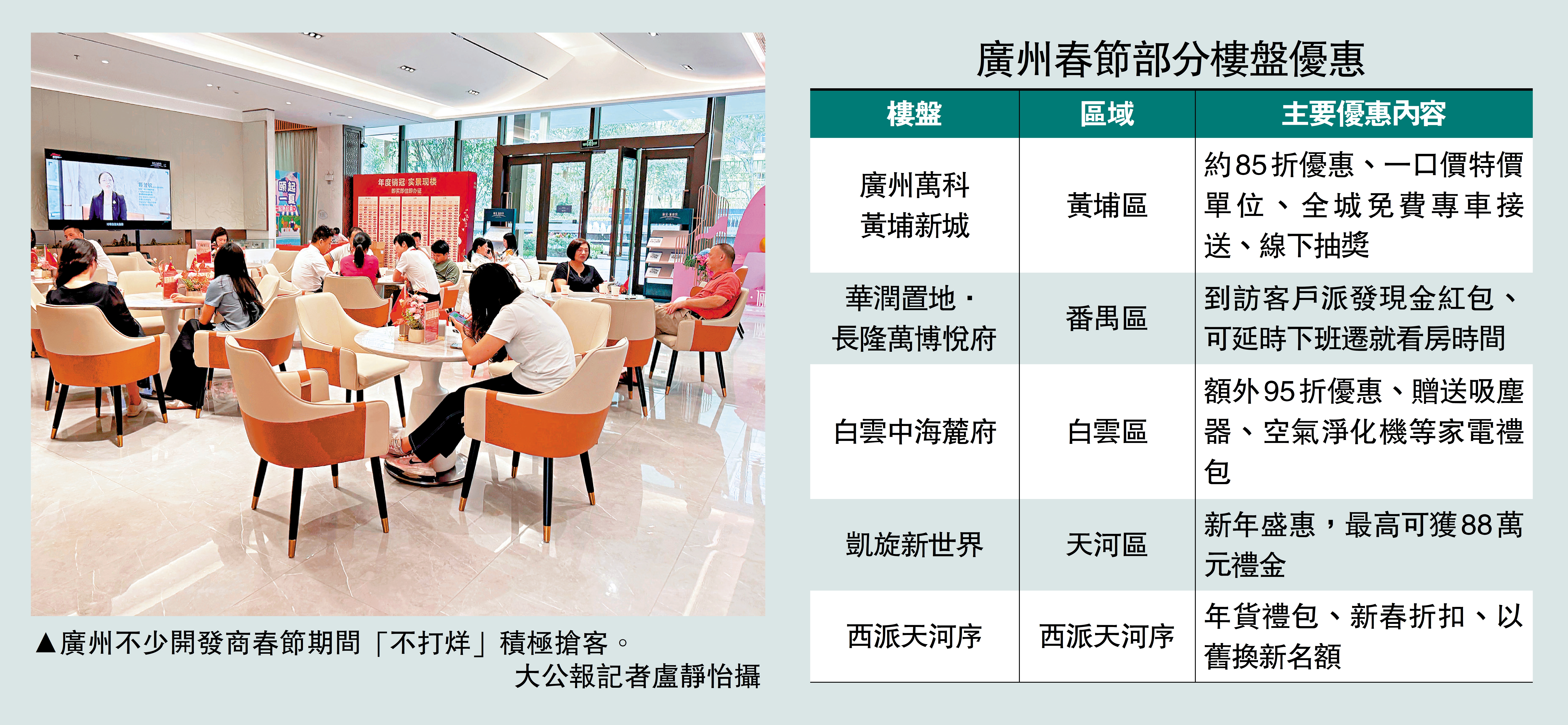 春節傳統上是樓市淡季,但今年內地在增值稅下調等利好政策帶動下,廣州不少新盤選擇留守「拚到最後」。據《大公報》記者統計,春節期間廣州7個區、逾30個新盤推出新春優惠,涵蓋折扣、紅包、特價單位及到訪禮等,優惠力度比以往更直接。