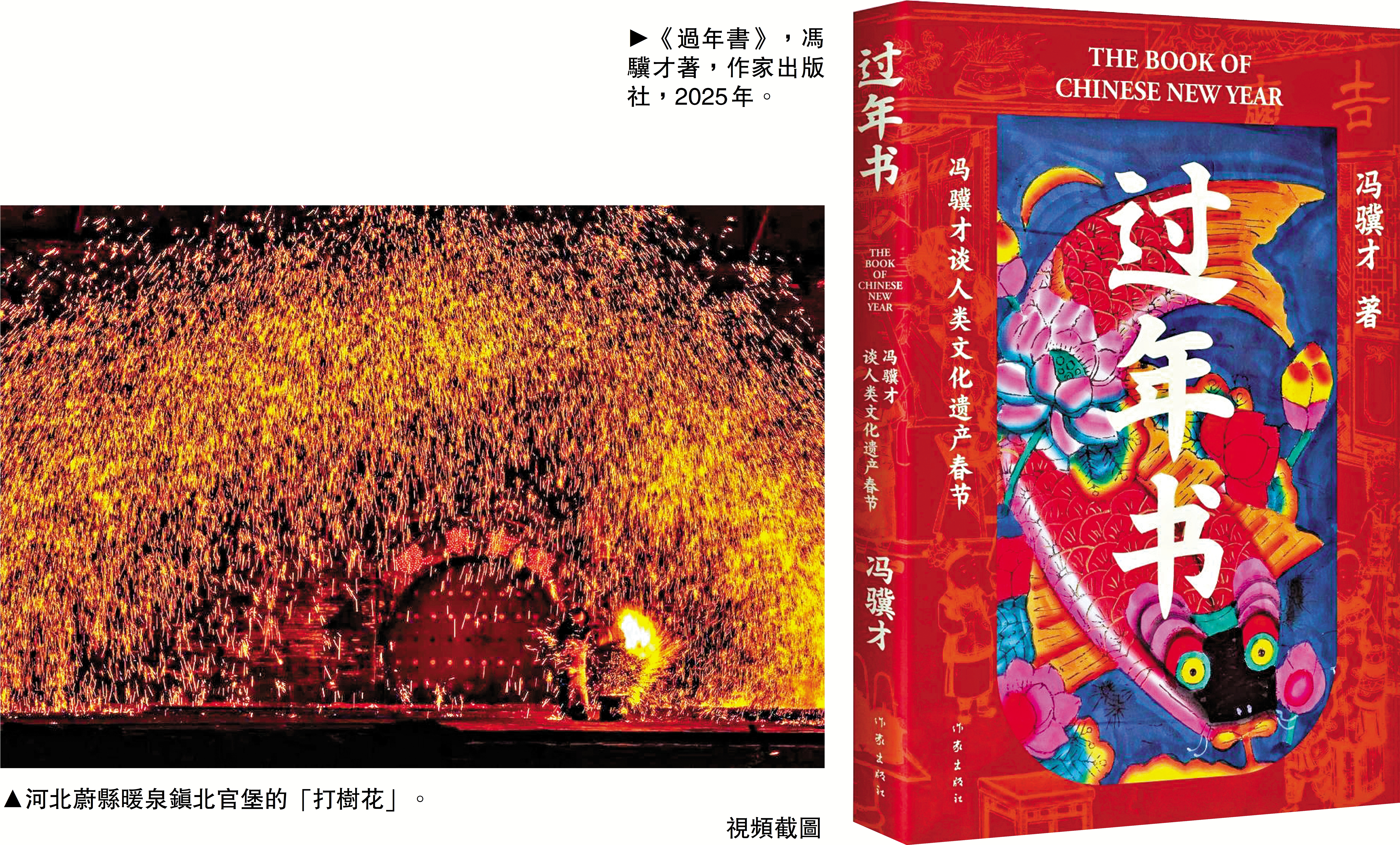 春節是中國最大的非遺。年俗是年文化的具體載體,內容十分廣泛,包括敬神、祭祖、年夜飯、燈籠、鞭炮、春聯、福字、窗花、年畫、香燭、壓歲錢、拜年、廟會、花會、社火等,涵括繪畫、書法、音樂、曲藝、雜技、戲劇、雕塑、民間工藝等藝術形式,形成一個獨特的文化空間。書中寫到了河北蔚縣暖泉鎮北官堡的「打樹花」,天津天后宮的剪紙,燕北敬祀火神的「拜燈山」,楊柳青年畫「缸魚」等各地的年俗藝術,並對年俗作了辯證思考。
