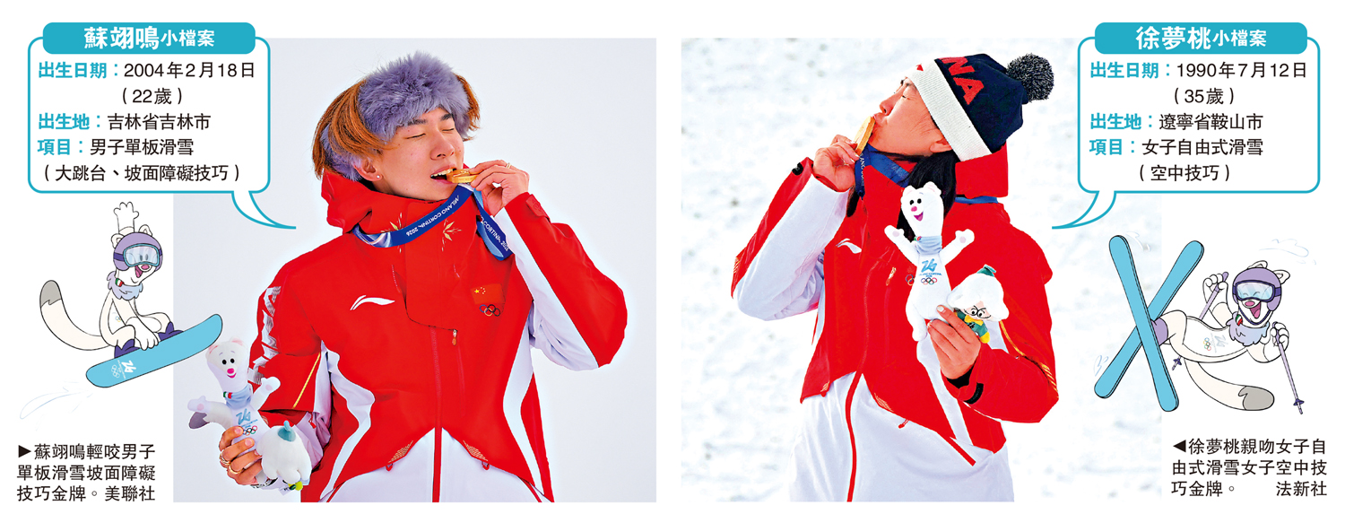 在同日稍後舉行的賽事,北京冬奧會冠軍、35歲的徐夢桃在自由式滑雪空中技巧女子決賽以112.9分蟬聯后冠,為國家隊在本屆冬奧會收穫第二枚金牌,另一位國家隊選手邵琪亦獲得了銅牌。國家隊18日在80分鐘連奪兩枚金牌。