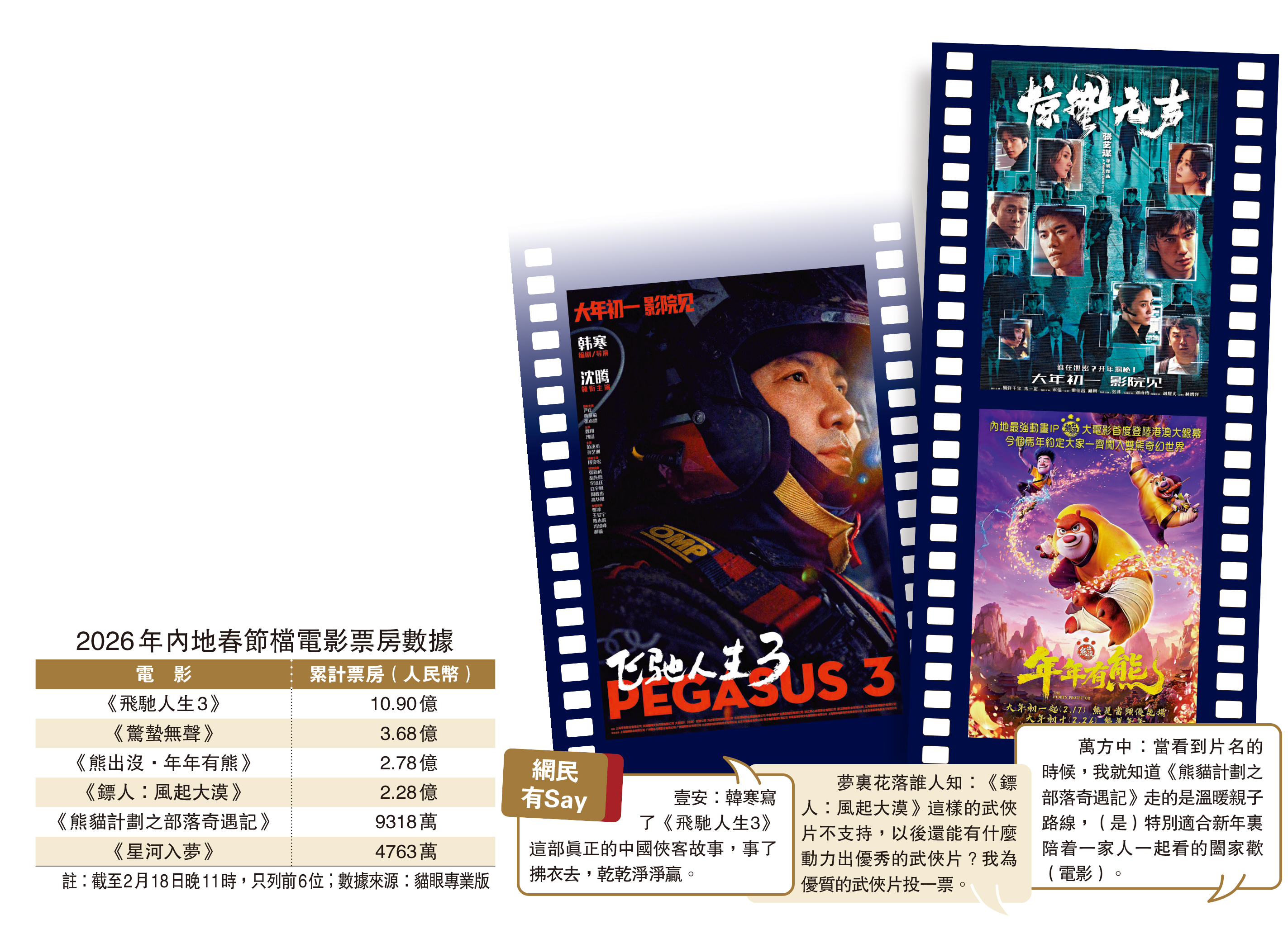 網絡平台數據顯示,2026年內地春節檔電影總票房(含預售)突破20億元(人民幣,下同)。《飛馳人生3》、《驚蟄無聲》、《熊出沒·年年有熊》位列前三。