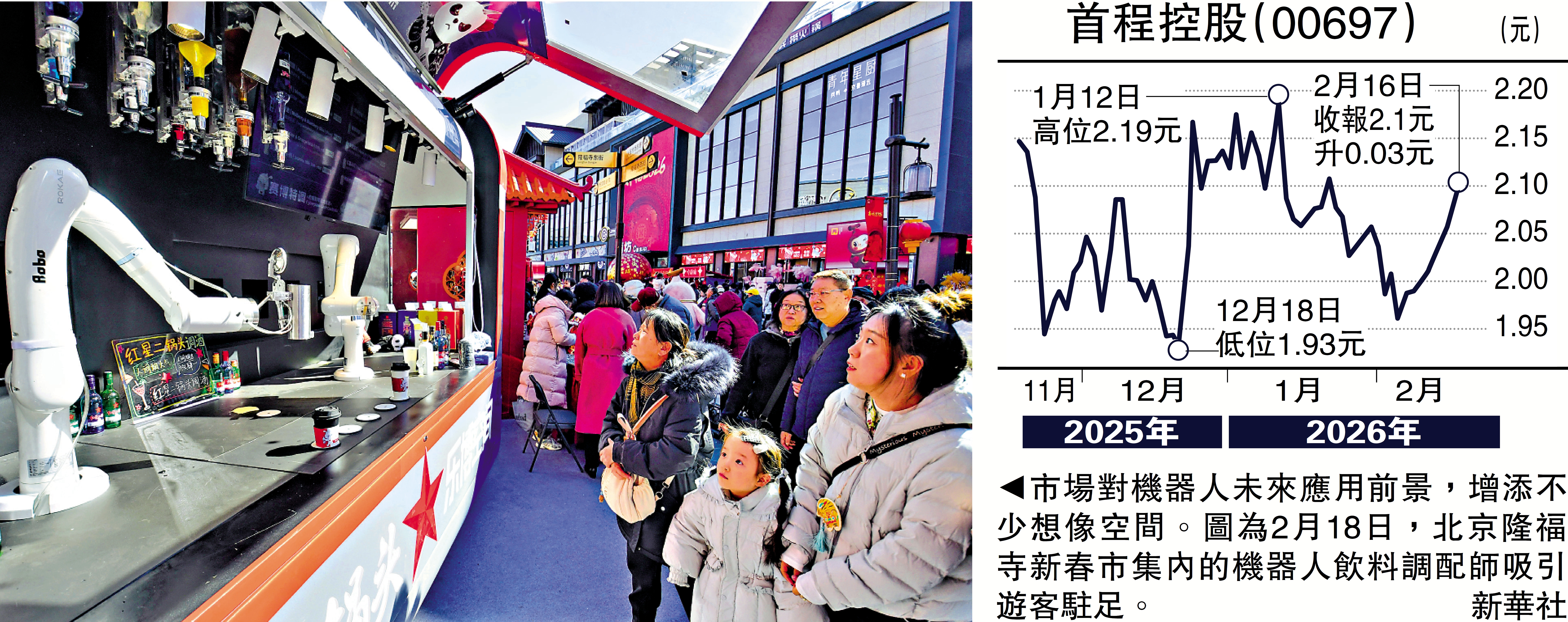另一個主題是央視春晚節目中的機器人表演,可謂進步神速,令觀眾大開眼界,更加心花怒放,對機器人未來應用前景,增添不少想像空間。據內媒報道,不少人看了春晚,都想買或租機器人,這一門生意迅速崛起及火紅起來。本欄曾提示機器人投資專家首程控股(00679)值得吸納,此股於除夕市一度回調至2.02元,收報2.1元,反升0.03元(1.4%),再呈「慢牛」升勢新突破,上升首個目標是2.2元,而另一個目標就是52周高位2.65元。我頭牌想強調,就是首程不是一隻炒股,而是一隻可投資的優質股,並且有停車場業務為經常性收益,加上所認購的人工智能及機器人、潮玩等企業有陸續上市的機會,在不斷有「爆炸性」增長點帶動下收益將會大增,乃一隻可作中長期投資的優質公司。