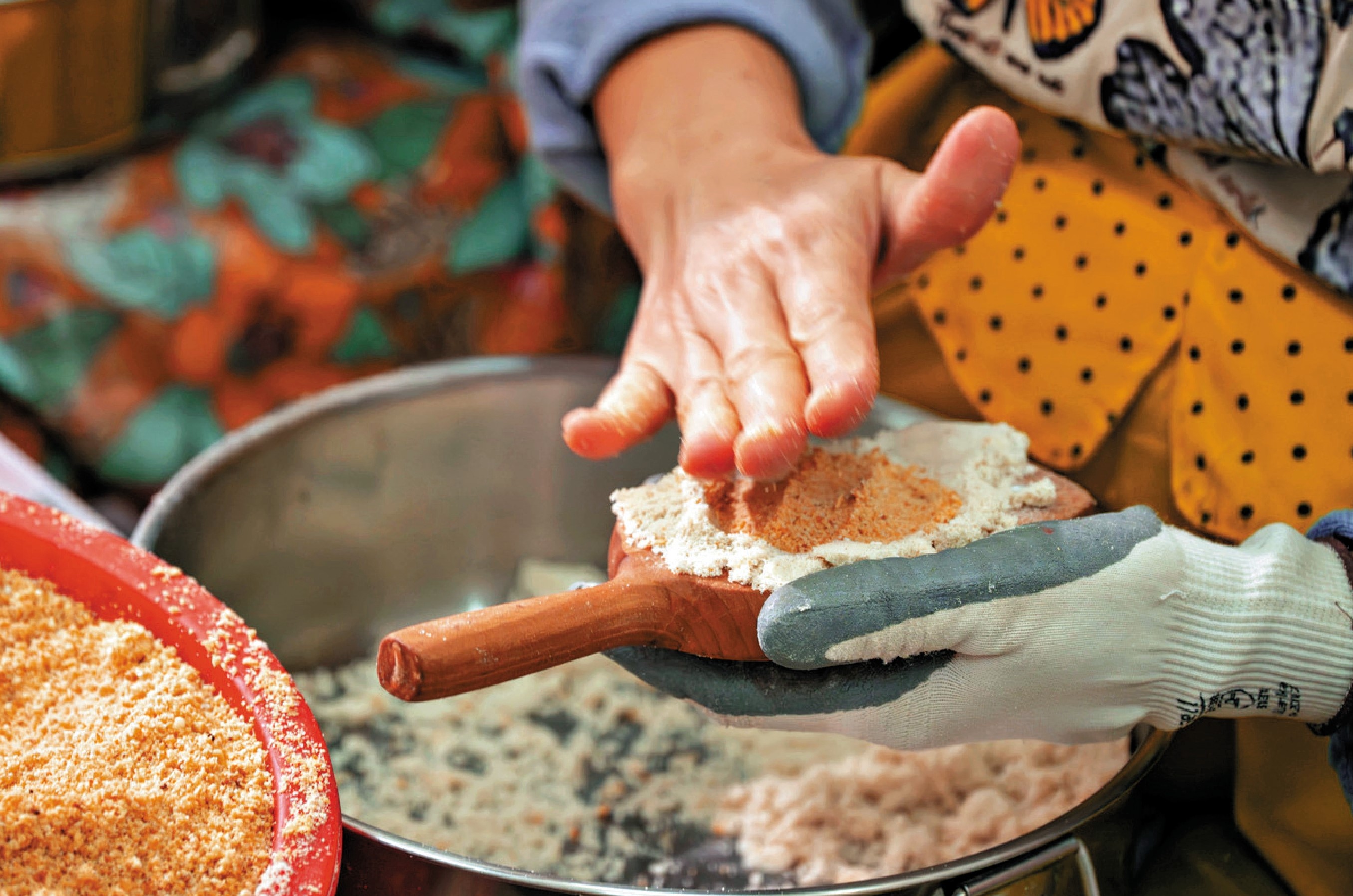 炒米餅的材料簡單,只有粘米、花生、白糖和片糖,但由炒米到「揼餅」,步步講究。首先要把粘米炒至金黃香脆,然後放涼磨粉,加入用片糖煮成的黃糖水,搓揉成粉團,粉團要做到一握成團,一推就散。餡料方面,就要將花生炒香、去皮磨碎,再拌入白糖。