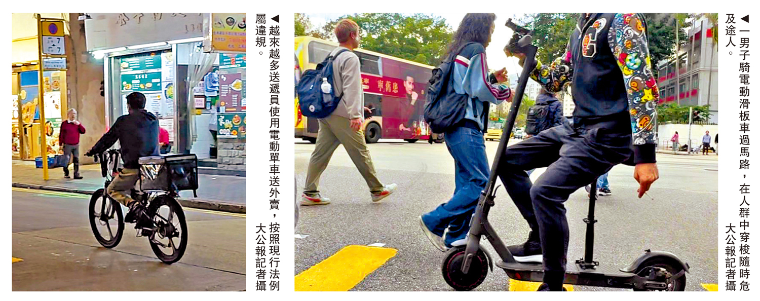 多名立法會議員關注立法前的「空窗期」。大公報記者直擊發現,不少騎手非法使用電動可移動工具,在道路左穿右插,汽車司機叫苦連天,更有騎手駛上行人道收掣不及撞入攤檔。除了眾多外賣員使用電動單車,也有家長載子女在馬路行駛,險象環生。\大公報記者 姚棠 伍軒沛