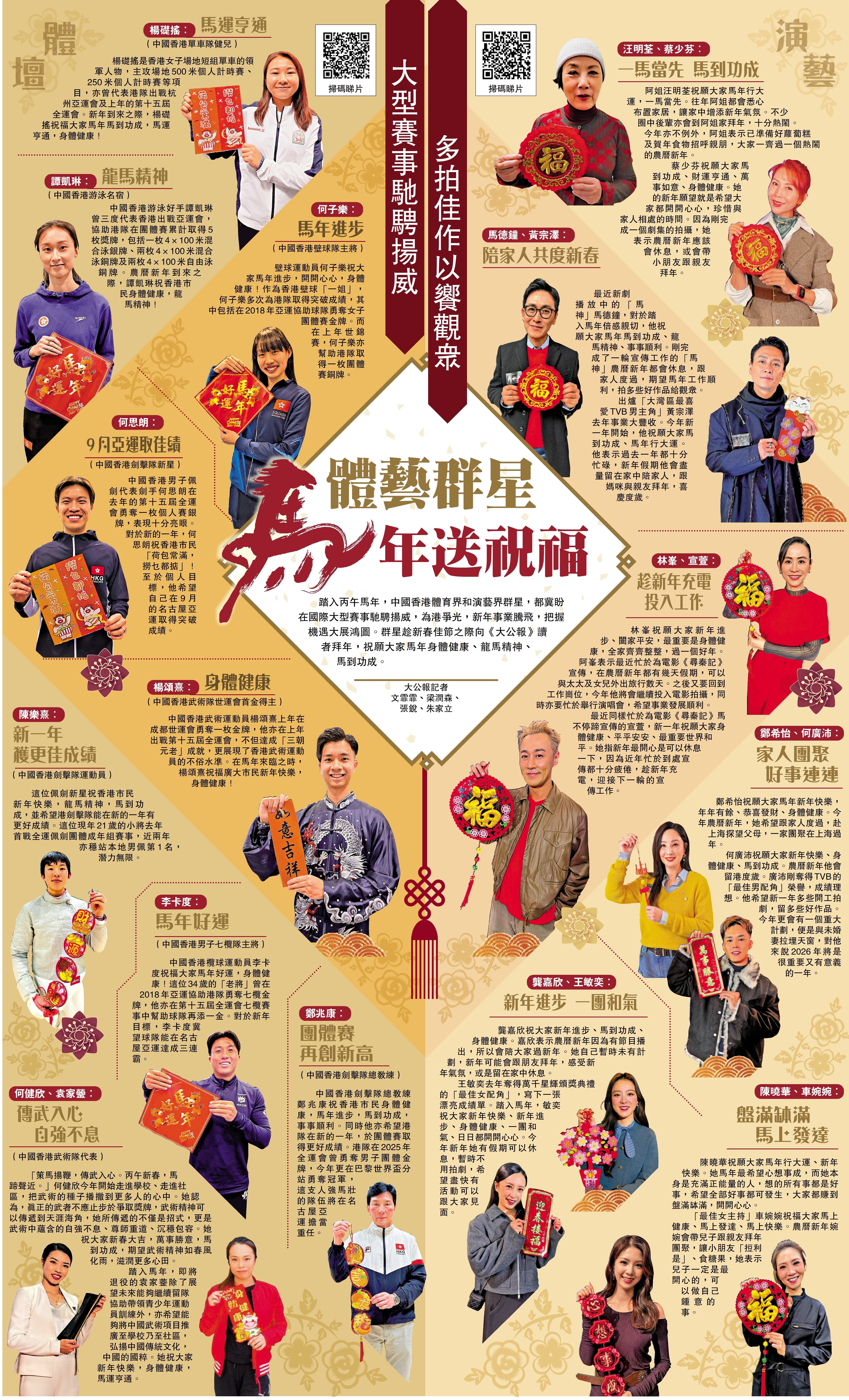 踏入丙午馬年,中國香港體育界和演藝界群星,都冀盼在國際大型賽事馳騁揚威,為港爭光,新年事業騰飛,把握機遇大展鴻圖。群星趁新春佳節之際向《大公報》讀者拜年,祝願大家馬年身體健康、龍馬精神、馬到功成。\大公報記者文霏霏、梁潤森、張銳、朱家立