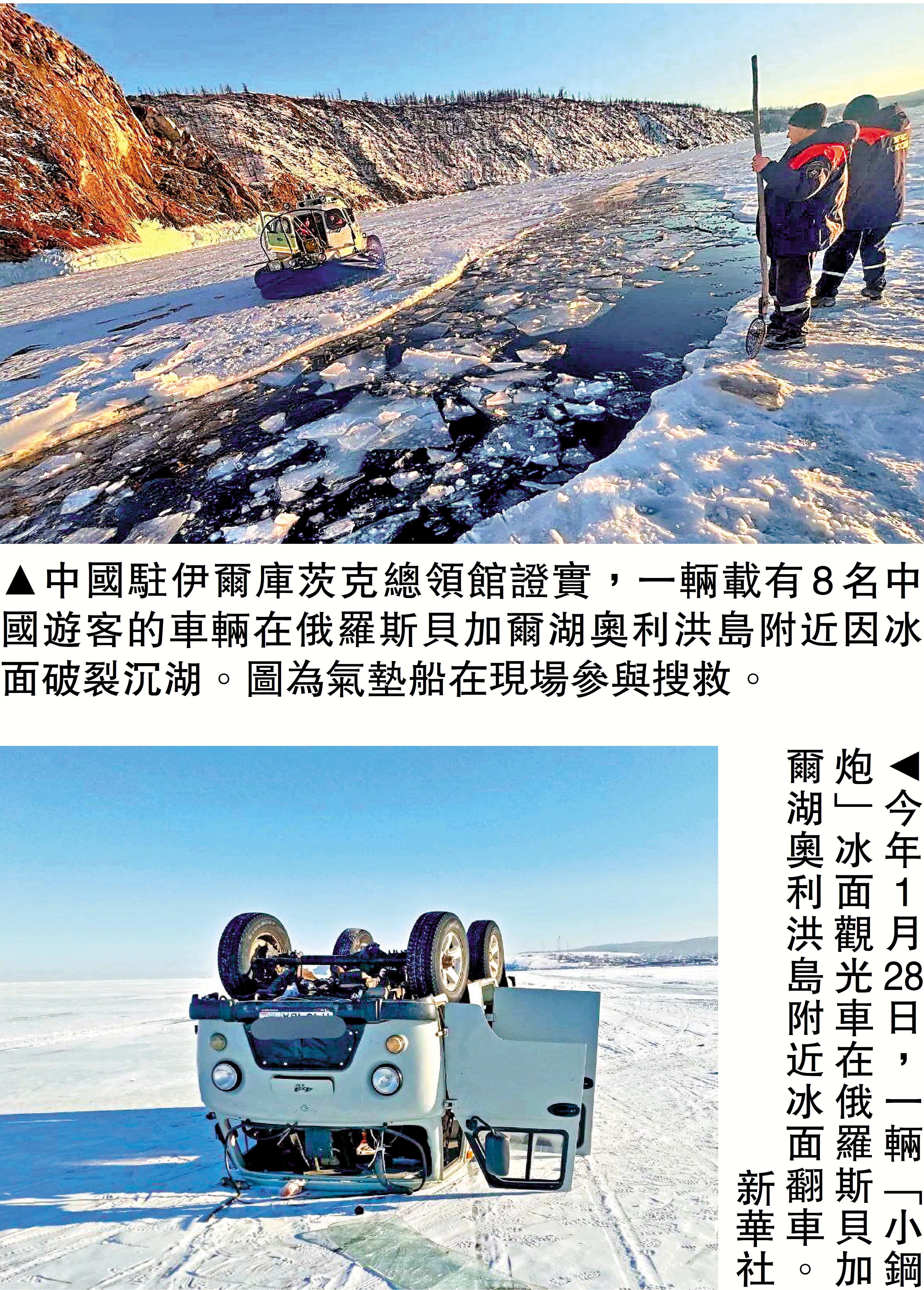 【大公報訊】綜合新華社、極目新聞、揚子晚報報道:中國駐伊爾庫茨克總領館20日向新華社記者證實,一輛載有8名中國遊客的車輛當天在俄羅斯貝加爾湖奧利洪島附近因冰面破裂沉湖,其中1名中國遊客逃生,其餘7名中國遊客溺亡。據央視新聞報道,已發現7名遇難者遺體,目前計劃展開潛水員打撈作業。總領館已派領事官員趕赴事發地,全力妥善處理善後事宜。據悉,涉事車輛上還載有1名俄羅斯司機。
