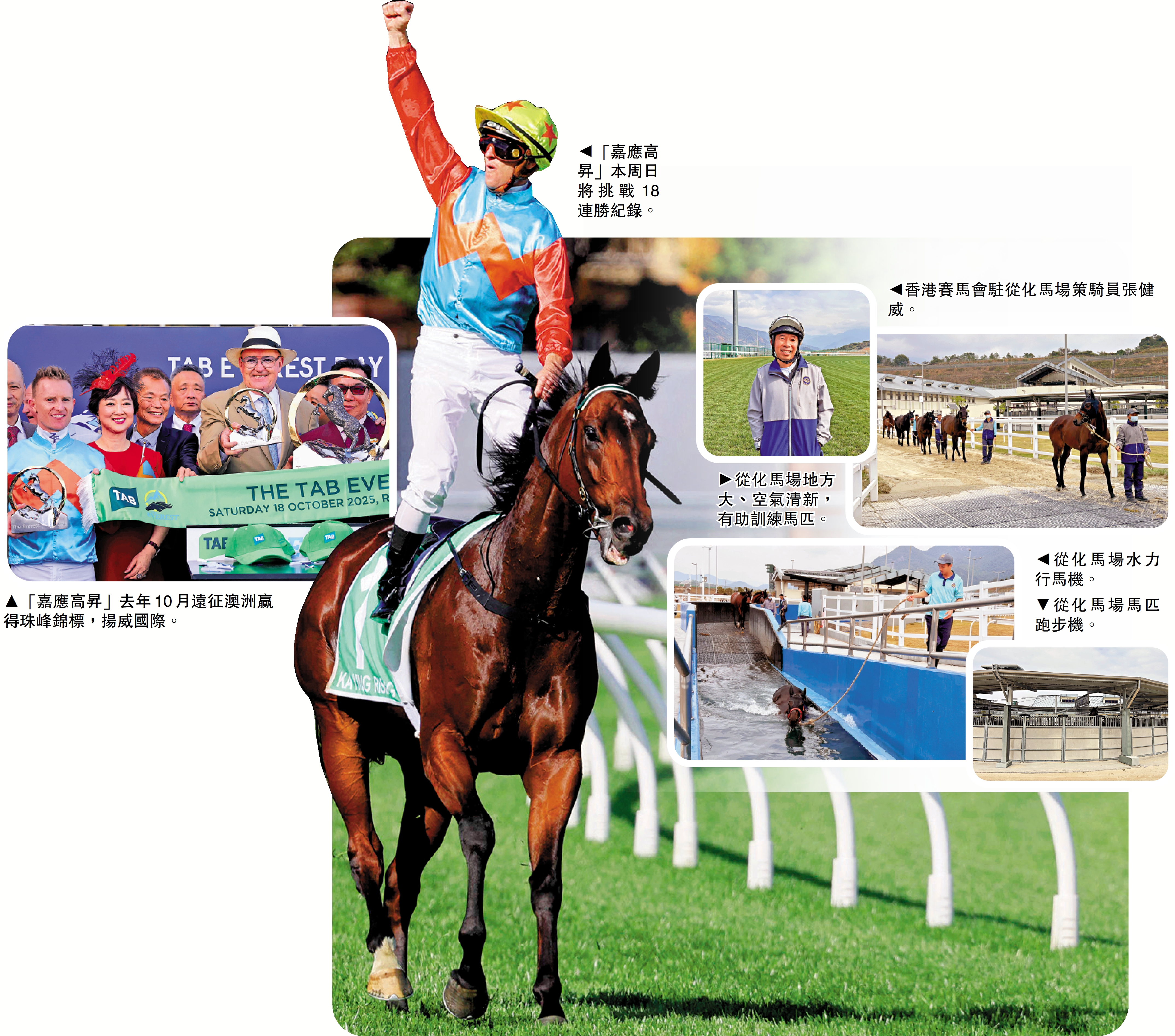 香港馬壇塵封近21年的連勝紀錄,有望迎來歷史性突破。應屆香港馬王「嘉應高昇」將於2月22日(年初六)出戰一級賽「女皇銀禧紀念盃」(1400米),若能一戰功成,將創造18連勝的輝煌紀錄,打破由傳奇馬王「精英大師」塵封近21年的香港連勝紀錄,改寫香港賽馬歷史。原來,「嘉應高昇」能夠長期保持頂尖狀態,與牠到從化馬場進行訓練有莫大關係。香港賽馬會駐從化馬場策騎員張健威表示,「嘉應高昇」很喜歡在從化馬場游泳和在草地上快跳,這對體能和狀態提升幫助很大。