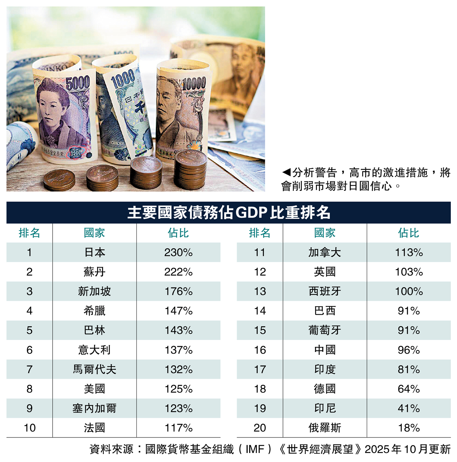 然而,在日圓面臨大幅貶值壓力的當下,若高市早苗推行再通脹政策,對日本經濟未必是好事。日圓貶值本身已推高進口貨品和原材料價格,再通脹政策可能令物價進一步攀升,卻因經濟疲弱而難以加息壓抑。
