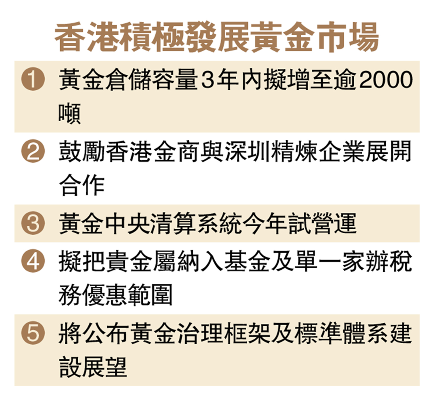 在倉儲設施方面,香港機場管理局已完成機場貴金屬儲存庫首階段擴建,容量達200公噸,並正積極落實進一步擴容至1000公噸的計劃。同時,上海黃金交易所已在香港建立首個離岸倉庫。此外,財庫局已與深圳市地方金融管理局簽署合作備忘錄,共同構建深度融合的區域黃金生態圈,為港深兩地開展加工貿易合作奠定基礎。在黃金交易清算方面,由特區政府全資擁有的公司所管理的香港黃金中央清算系統計劃於今年內開展試營運。
