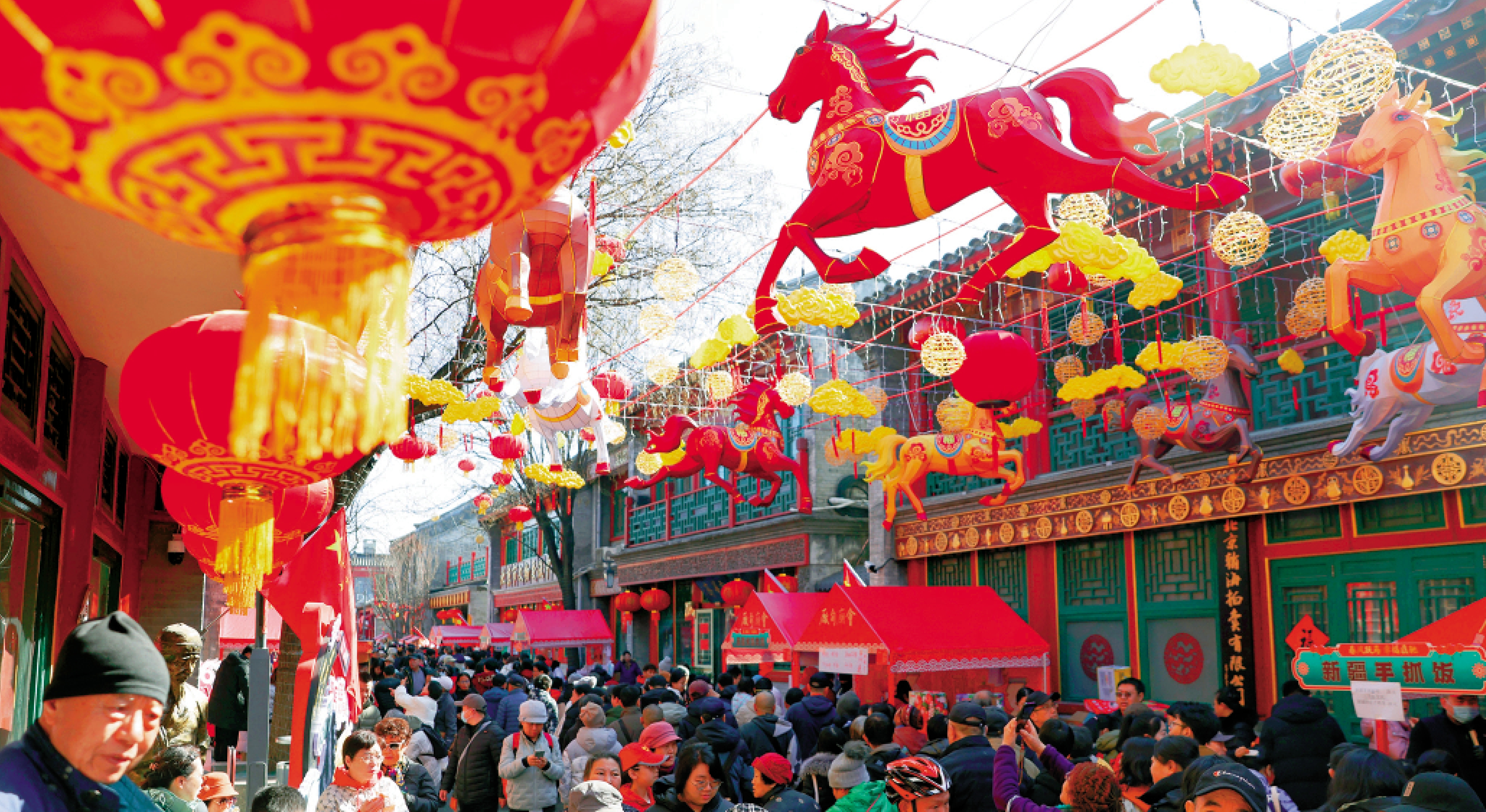【大公報訊】記者任芳頡北京報道:大年初五迎財神,年味正濃,福氣滿街。循着喧騰人聲走進北京廠甸廟會,這座擁有四百年歷史的國家級非遺「文市」,正以「春風躍馬 幸福驫馳」為主題,將中華尚馬精神與非遺傳承深度融合。步入琉璃廠古文化街,「五花馬」主視覺與鎏金祥雲紋樣裝點街巷,紅彤彤的春聯、福字與駿馬造型燈籠交相輝映,人頭攢動間,歡聲笑語裹挾着撲面而來的喜慶氛圍,一場別開生面的馬年新春文化盛會,在筆墨書香與市井煙火中鋪展開來,盡顯老北京最地道的年味兒。