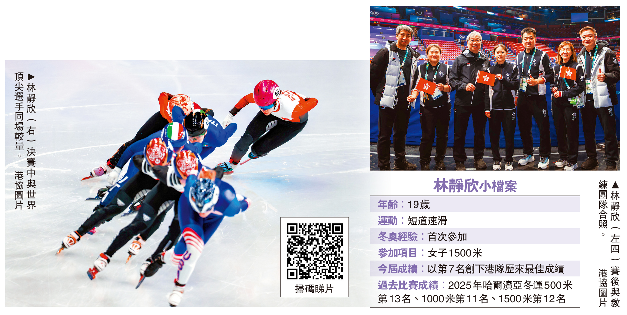 【大公報訊】20日進行的米蘭冬奧會女子1500米比賽中,中國香港短道速滑小將林靜欣上演屬於自己的「米蘭不思議」,她歷史性成為首個香港選手闖入冬奧會短道速滑決賽,最終以第7名完成賽事,寫下港隊在冬奧最佳成績後,她獲得「賽馬會優秀運動員獎勵計劃」頒發375000港元獎金以作鼓勵。