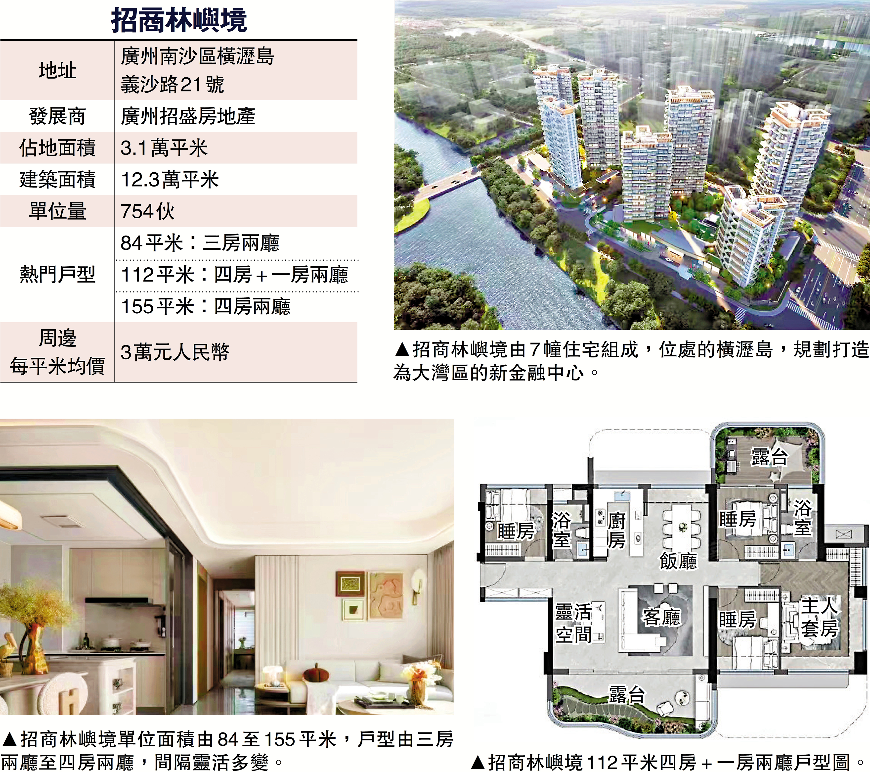 招商林嶼境由7幢住宅組成,樓高17至32層,提供754個單位,主推戶型面積由84至155平米,間隔分別為三房至四房。