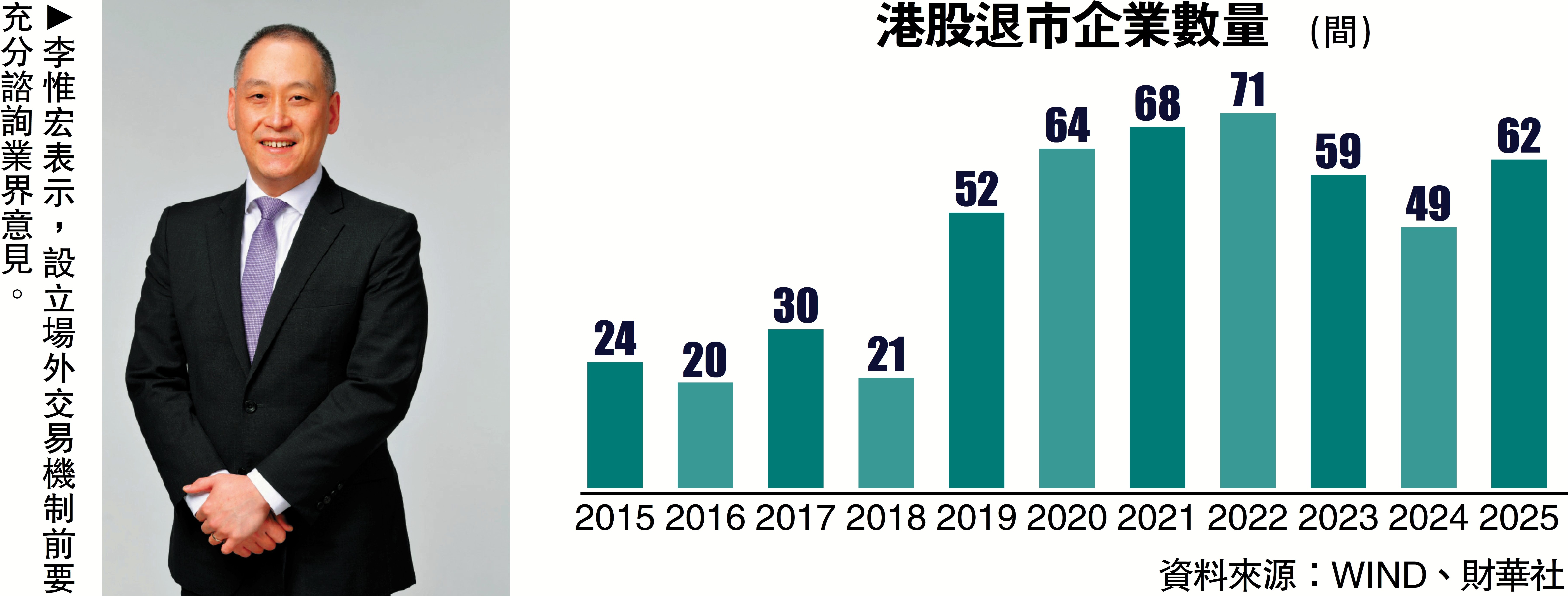 統計顯示,2024年有49間港股公司退市,其中32間按照《上市規則》的除牌程序被取消上市地位,相關公司市值約177億元,另外15間私有化退市、1間自願撤回上市、1間贖回。至於2025年共有62間公司退市。