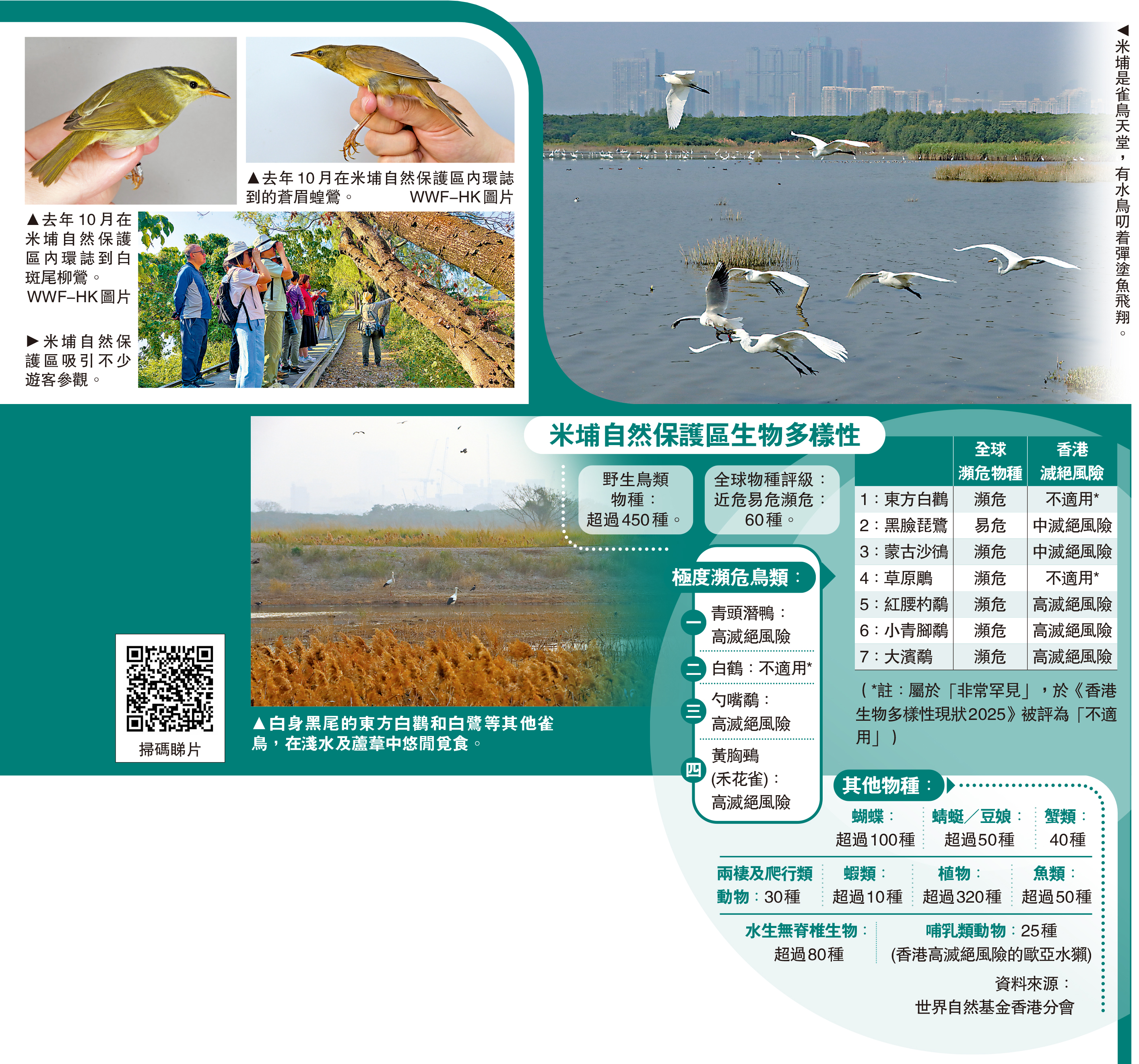 同月,香港鳥類環誌小組亦於保護區的蘆葦叢中,追蹤到一隻白斑尾柳鶯,該物種於2017年以來首次在香港被記錄,非常罕見。據了解,白斑尾柳鶯通常偏好森林生境,但今次環誌紀錄表明,在遷徙途中,牠們都會利用不同類型的棲息地短暫休息。而米埔的灘塗、基圍、魚塘同蘆葦叢等豐富的生境類型,就為候鳥提供良好的庇護和棲息。