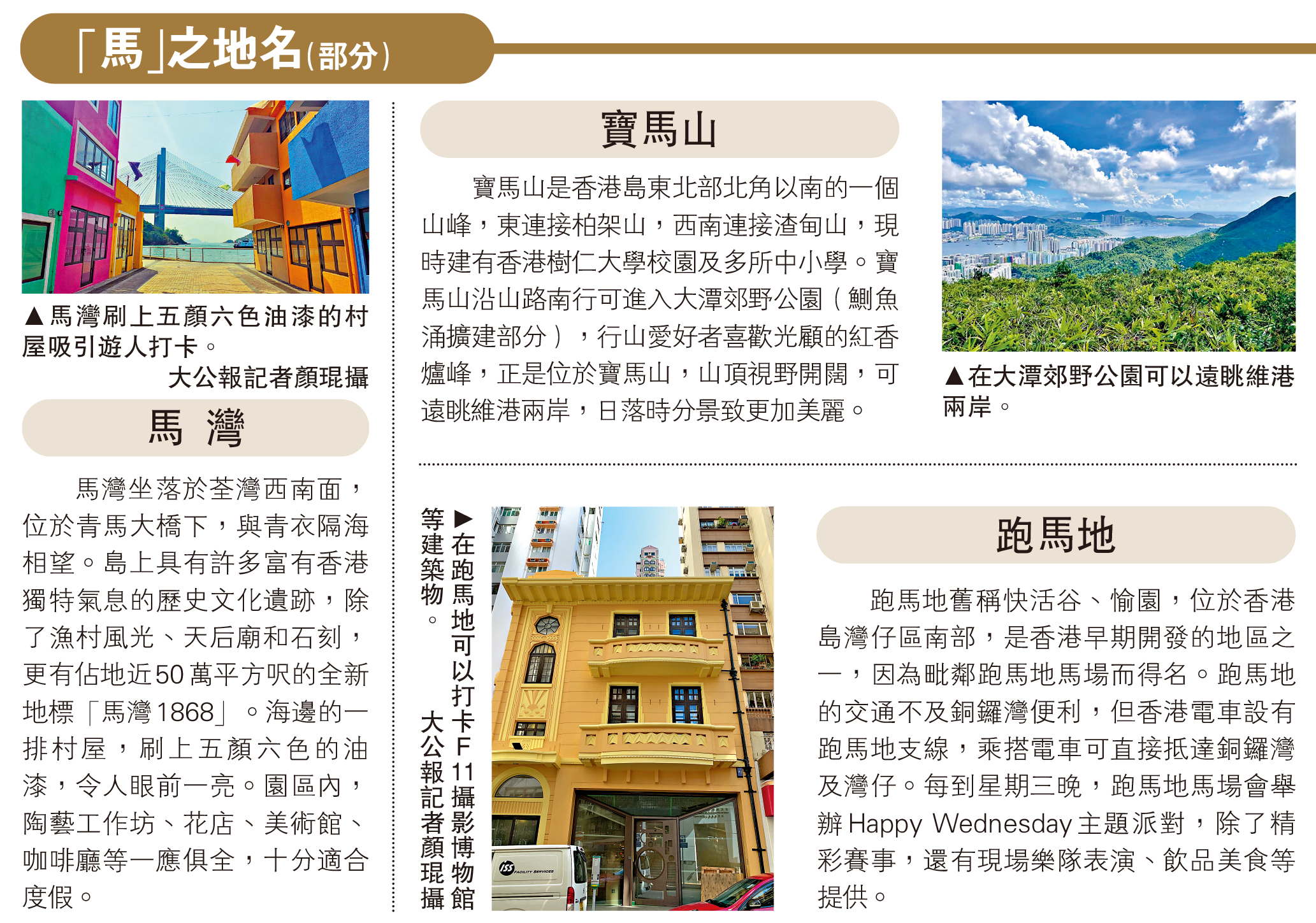 跑馬地舊稱快活谷、愉園,位於香港島灣仔區南部,是香港早期開發的地區之一,因為毗鄰跑馬地馬場而得名。跑馬地的交通不及銅鑼灣便利,但香港電車設有跑馬地支線,乘搭電車可直接抵達銅鑼灣及灣仔。每到星期三晚,跑馬地馬場會舉辦Happy Wednesday主題派對,除了精彩賽事,還有現場樂隊表演、飲品美食等提供。