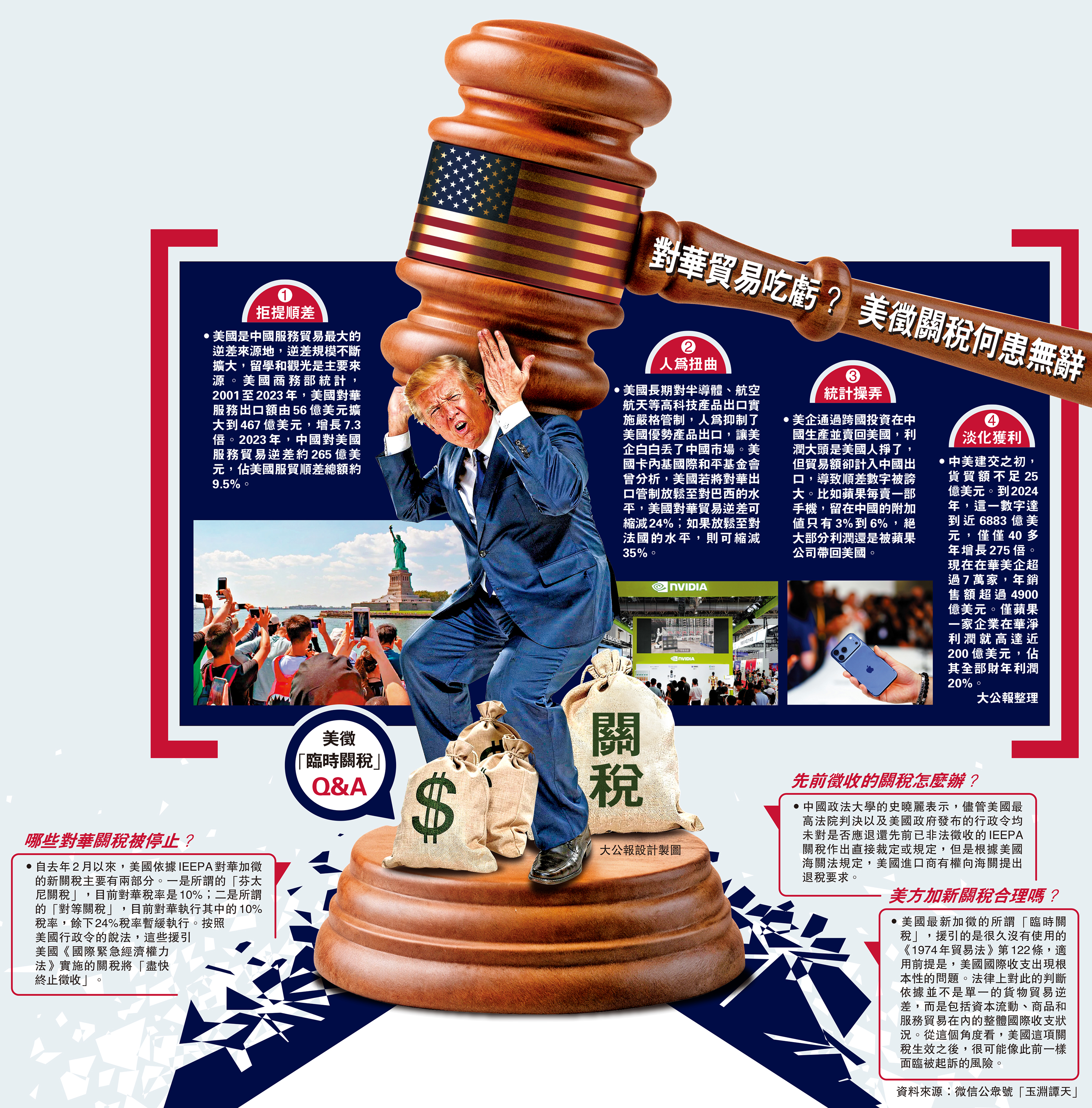 以中美貿易為例,美國是貨物貿易逆差,但服務貿易對華是順差。中國國務院新聞辦公室去年發布白皮書指出,2001至2023年,中美服務貿易額由89.5億美元擴大到668.6億美元,增長了6倍。也就是說,美國對華加徵所謂「臨時關稅」,在法律上未必站得住腳。