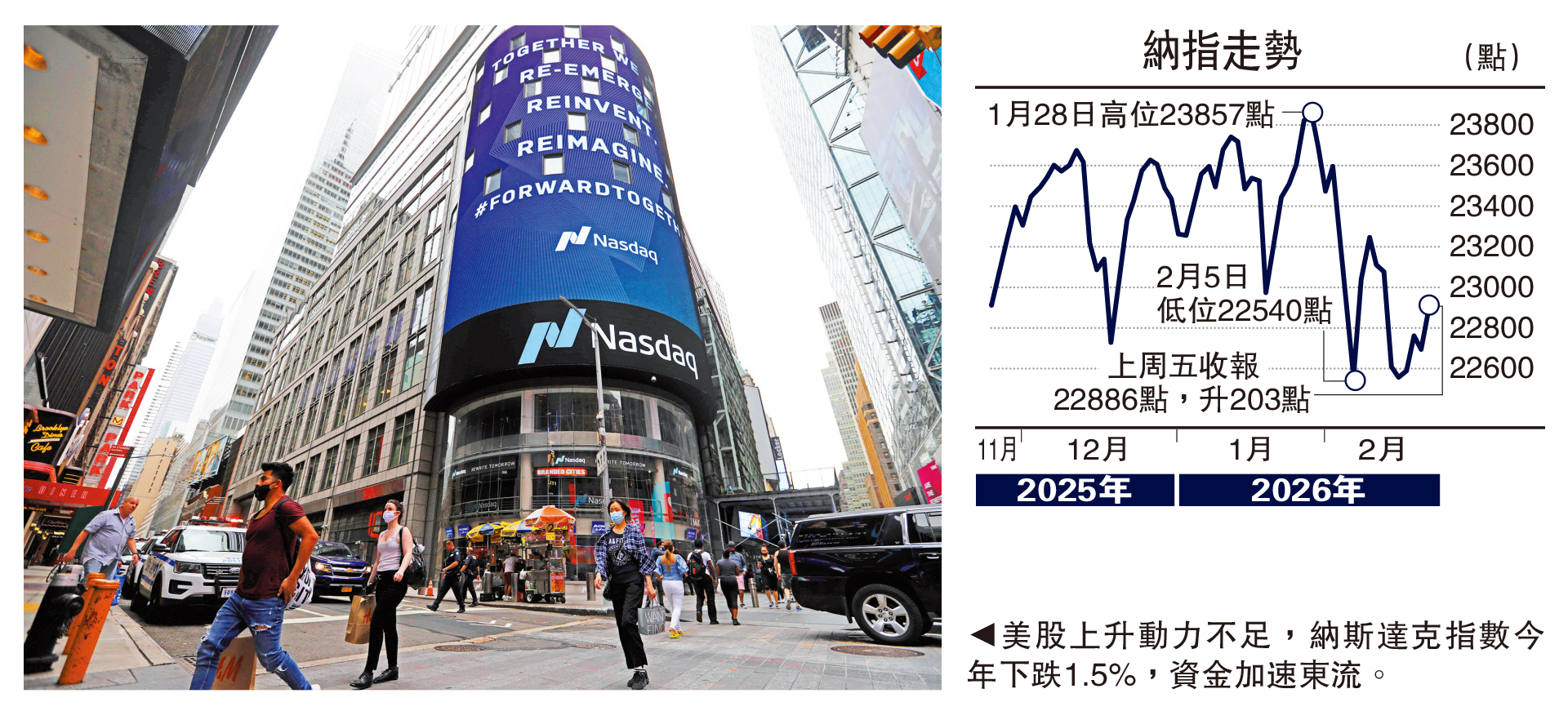 今年以來,環球股市呈現分化,美股上升動力不足,納斯達克指數今年下跌1.5%,跑輸MSCI環球指數約3%的升幅,更遜於年內上升9.4%的上海科創指數,證明資金加速東流,押注更多中國科技股。面對特朗普關稅政策多變,全球減倉美資產行動持續。統計顯示,今年首八周,美股產品走資520億美元(折合4000多億港元),為16年來最多。