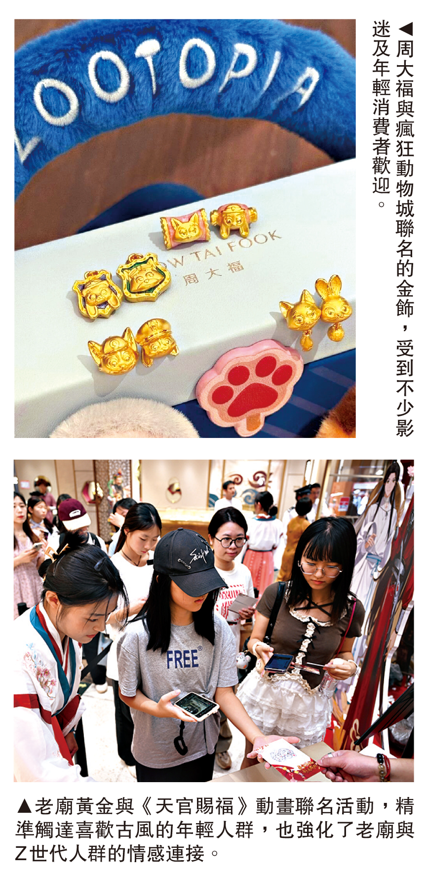 為了吸引更多年輕消費者,以周大福、老鳳祥等「老字號」為代表的黃金珠寶品牌開始加大與IP聯名力度,在形狀款式、工藝設計、材質重量等方面都進行了改良創新。例如周大福與瘋狂動物城聯名的金飾受到不少影迷喜愛,潮宏基與線條小狗聯名產品也讓不少網友直呼可愛。