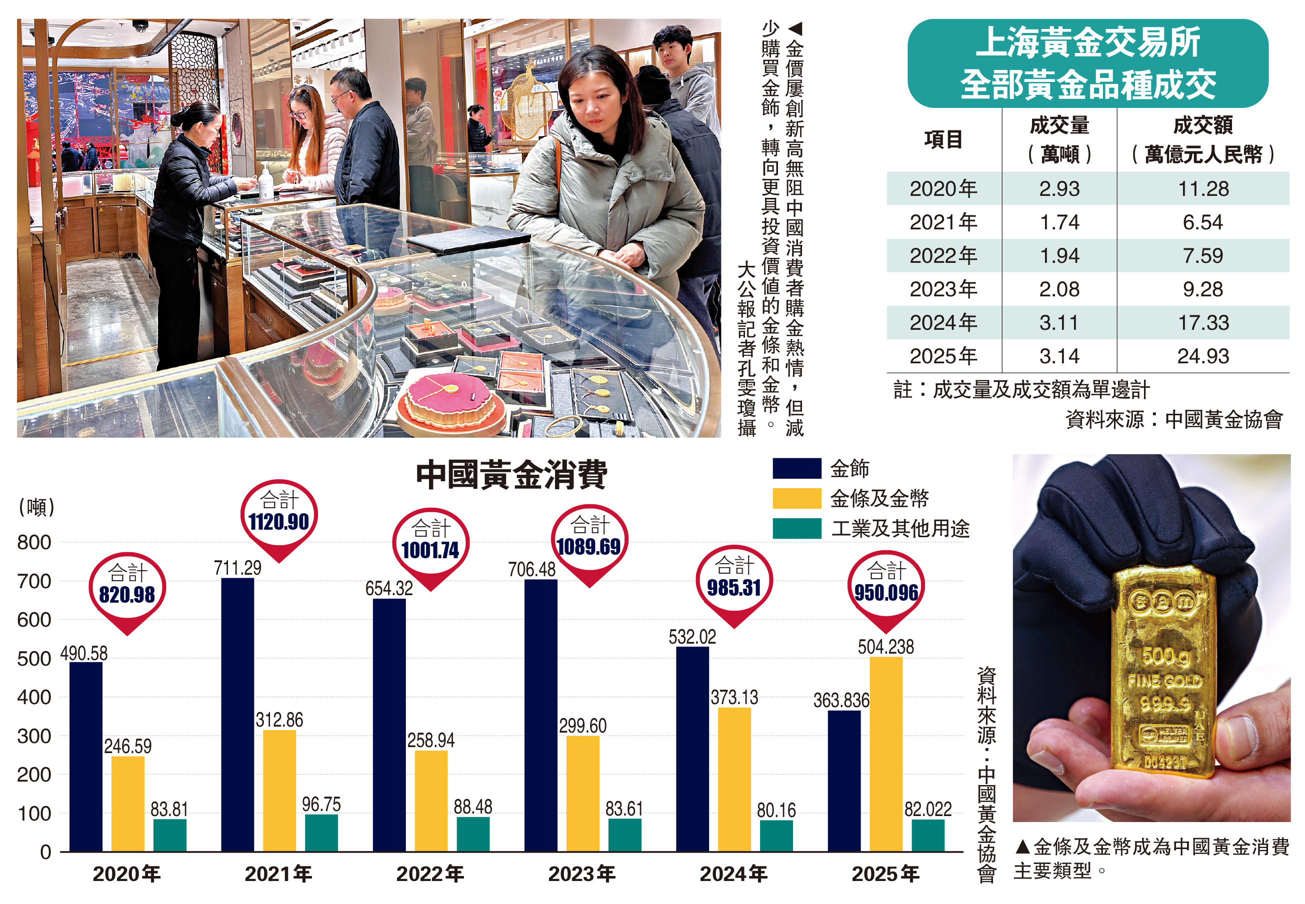 根據中國黃金協會2月5日發布的數據顯示,2025年中國金條及金幣消費量首次超越黃金首飾,標誌着黃金市場消費結構迎來階段性轉變。\大公報記者 倪夢璟 孔雯瓊