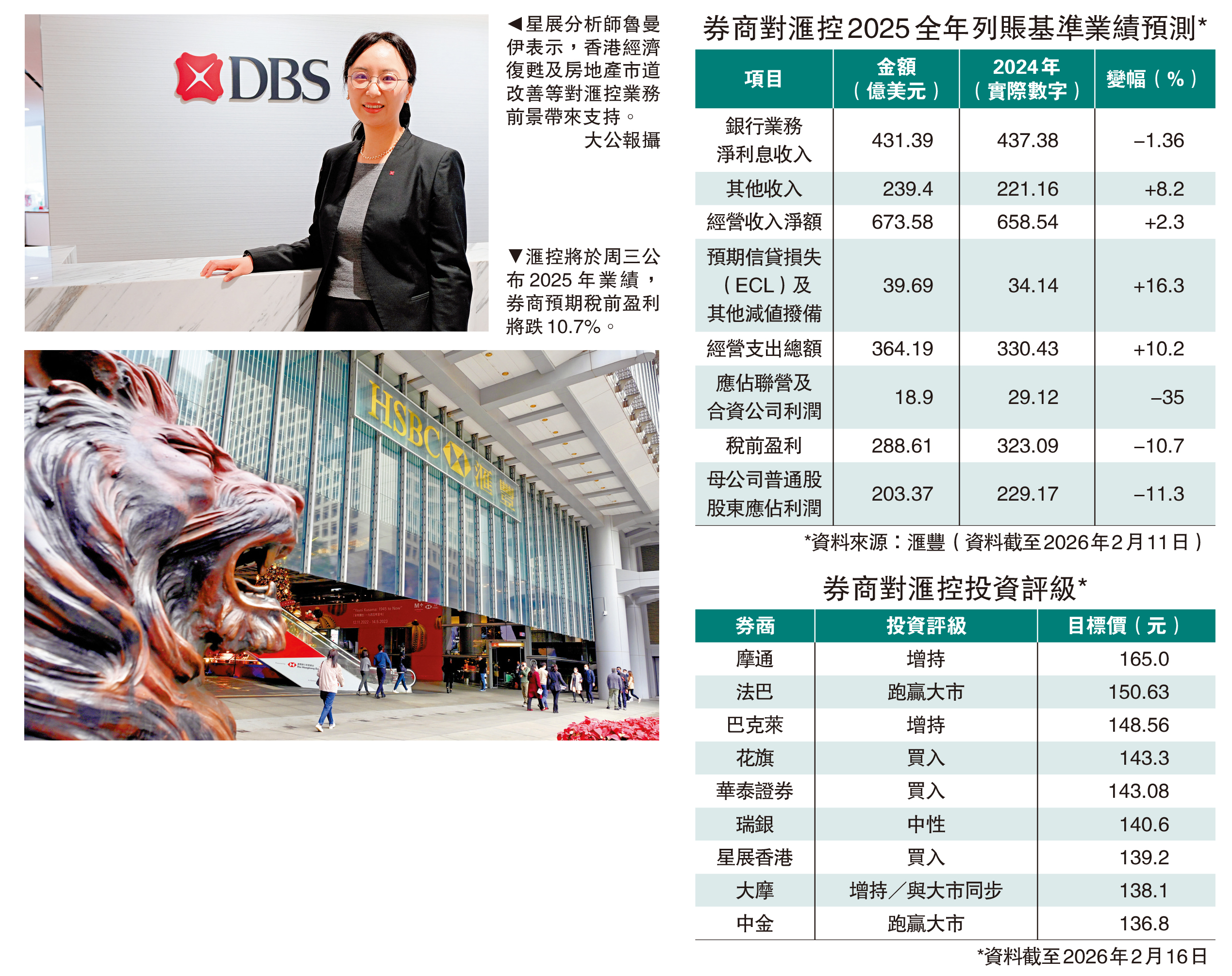 環球金融集團滙豐控股(00005)將於周三(25日)公布2025全年業績,以列賬基準(Reported Basis)計算,券商預期滙控全年稅前盈利(Profit Before Tax, PBT)為288.61億(美元,下同,約2251億港元),按年減少10.7%。儘管如此,券商相信滙控業績將保持穩健。滙控在2024年錄得稅前盈利逾323億元,是歷來最佳年份。星展香港研究部助理董事兼中國/香港銀行研究分析師魯曼伊表示,以固定匯率基準計算的稅前盈利(underlying PBT)按年比較將「稍為下降」,部分原因是預料其預期信貸損失(ECL)和經營成本將會增加,而滙控手上持有的交通銀行(03328)股權也被攤薄。\大公報記者 黃裕慶
