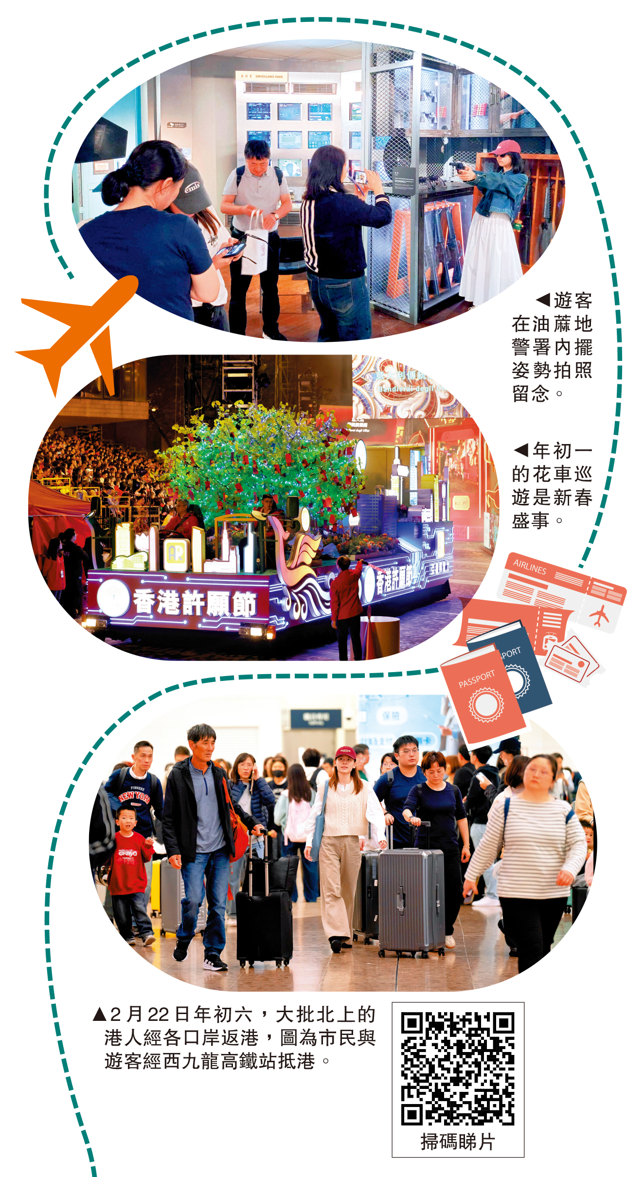 春節假期昨日結束,截至昨晚9時,入境處於各口岸共錄得102.2萬出入境人次,當中入境超過63.4萬人次;內地春節長假亦在今日完結,年廿九至初五,六日共約102萬內地客入境香港,按年升13%。