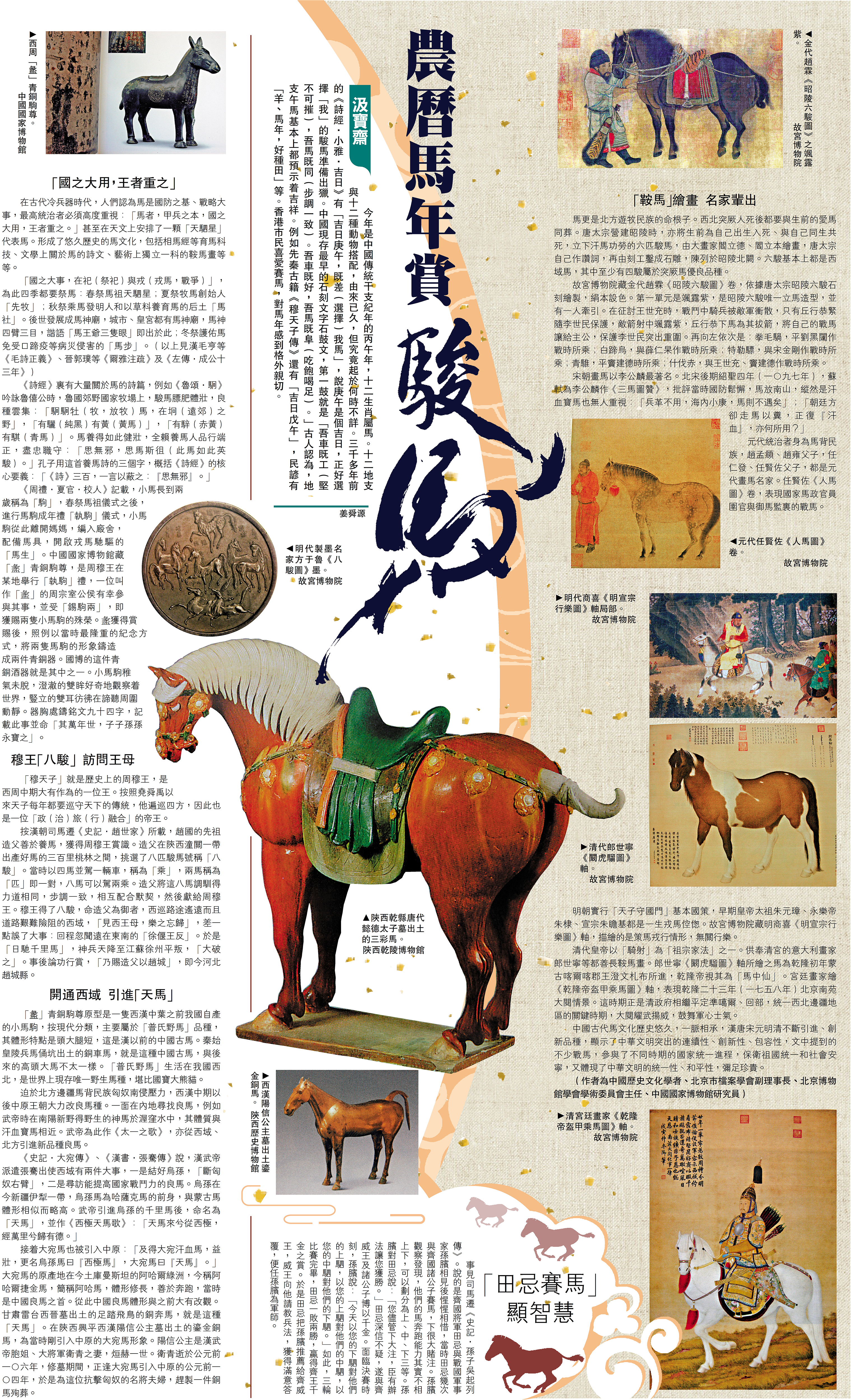 今年是中國傳統干支紀年的丙午年,十二生肖屬馬。十二地支與十二種動物搭配,由來已久,但究竟起於何時不詳。三千多年前的《詩經·小雅·吉日》有「吉日庚午,既差(選擇)我馬」,說庚午是個吉日,正好選擇「我」的駿馬準備出獵。中國現存最早的石刻文字石鼓文,第一鼓就是「吾車既工(堅不可摧),吾馬既同(步調一致)。吾車既好,吾馬既阜(吃飽喝足)。」古人認為,地支午馬基本上都預示着吉祥。例如先秦古籍《穆天子傳》還有「吉日戊午」,民諺有「羊、馬年,好種田」等。香港市民喜愛賽馬,對馬年感到格外親切。/姜舜源