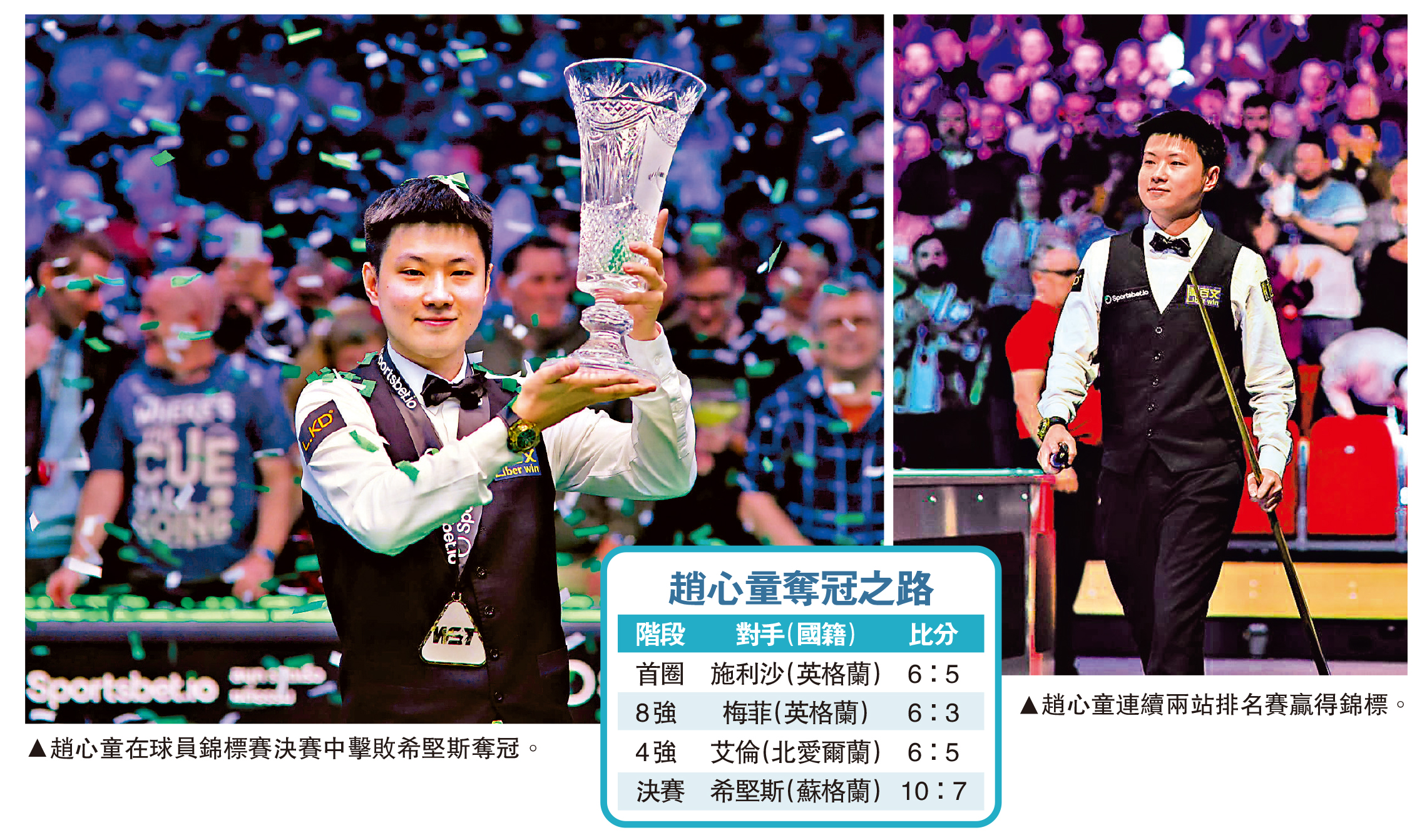 應屆桌球世界冠軍中國球手趙心童,23日在英國德爾福特出戰球員錦標賽決賽,面對蘇格蘭名將希堅斯,在落後6:7下連贏4局,最終以局數10:7反勝捧盃,這是趙心童繼在香港上演的世界桌球大獎賽後連續兩站排名賽奪標。趙心童賽後創下3大個人紀錄,包括成為首個在這項賽事奪冠的中國球員,歷史上第4位職業生涯首5次排名賽闖入決賽全部奪冠的球員,以及世界排名首次升上第5。\大公報記者 梁潤森