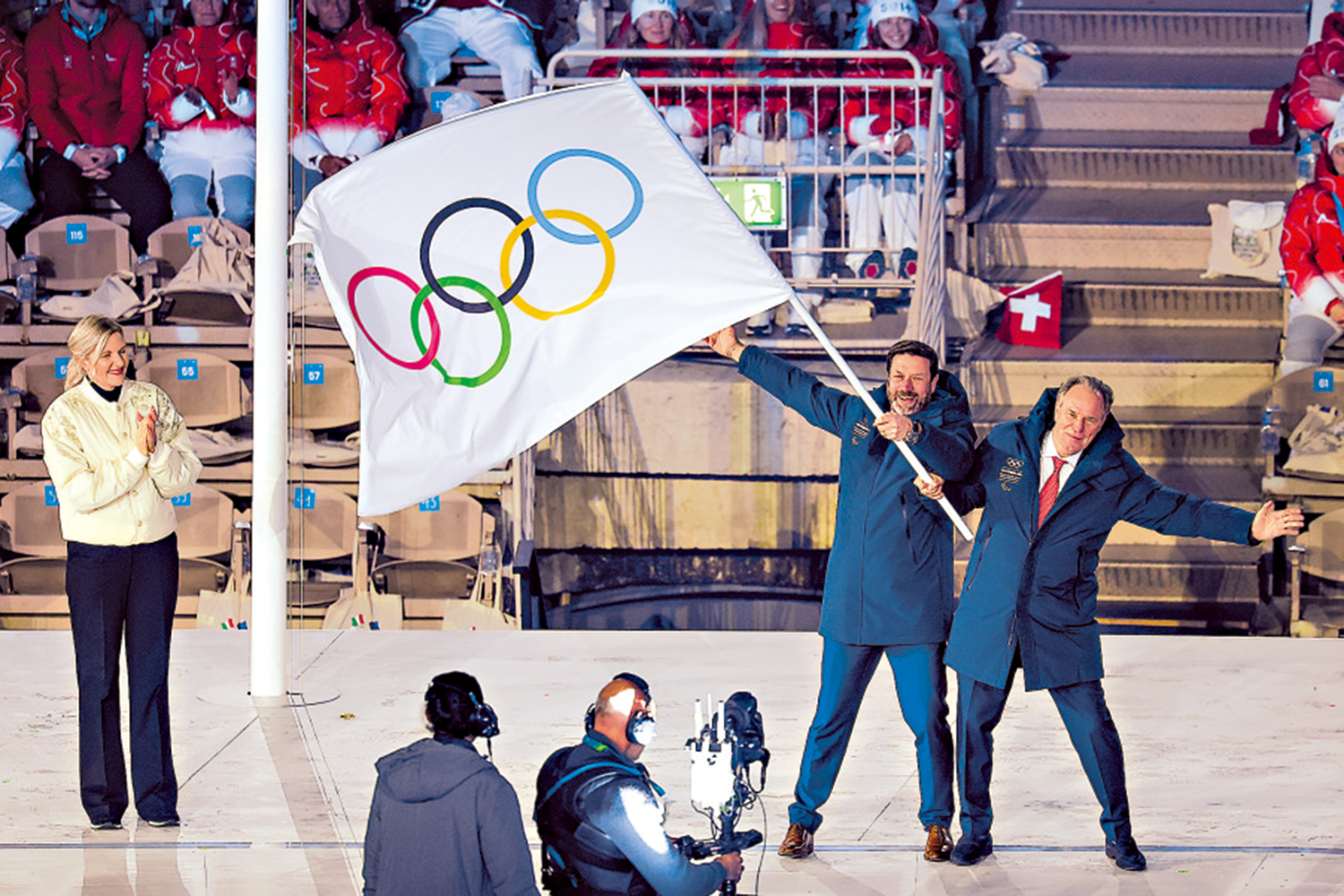 閉幕式尾聲,奧林匹克會旗緩緩降下,由米蘭市市長薩拉和科爾蒂納丹佩佐市市長洛倫齊交給考文垂,再由考文垂交給2030年冬奧舉辦地法國普羅旺斯─阿爾卑斯─藍色海岸大區和奧弗涅─羅訥─阿爾卑斯大區代表。考文垂宣布,2026年米蘭冬奧閉幕。聖火在米蘭和科爾蒂納兩地同時熄滅。