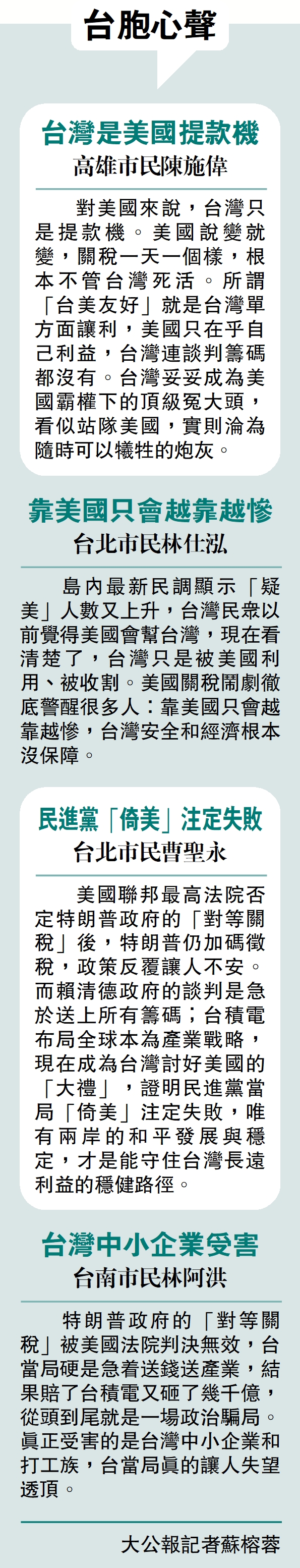特朗普政府的「對等關稅」被美國法院判決無效,台當局硬是急着送錢送產業,結果賠了台積電又砸了幾千億,從頭到尾就是一場政治騙局。真正受害的是台灣中小企業和打工族,台當局真的讓人失望透頂。\大公報記者蘇榕蓉