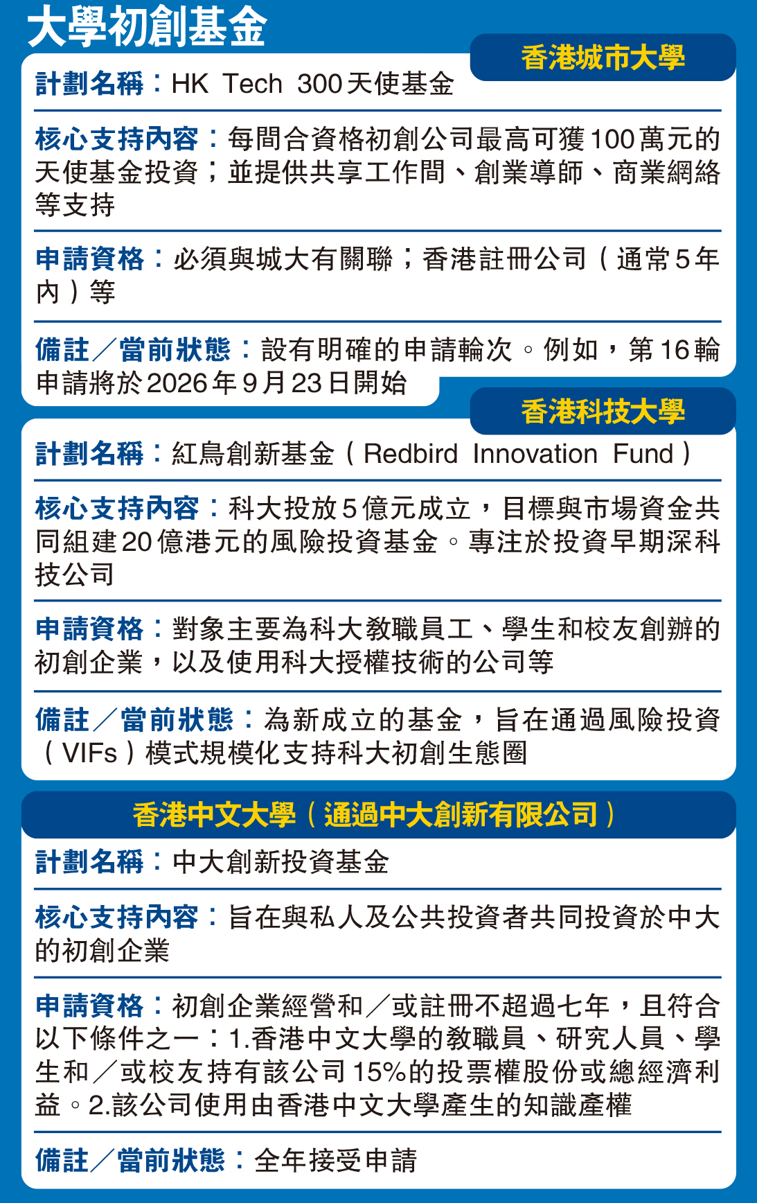 申請資格:對象主要為科大教職員工、學生和校友創辦的初創企業,以及使用科大授權技術的公司等