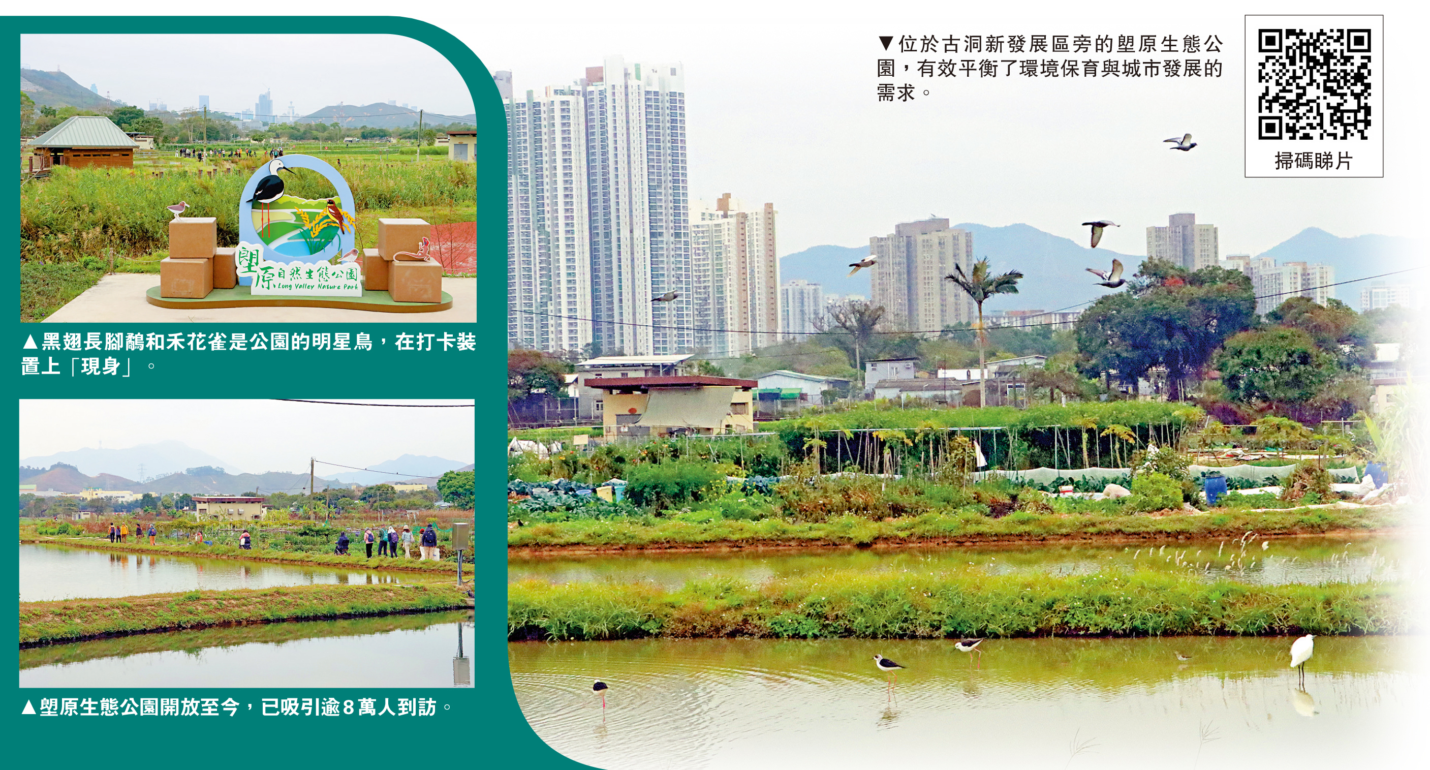 香港的北部都會區,擁有豐富多樣的生境與自然資源,生態格局獨特。「環境好不好,就看鳥多少」,位於古洞北新發展區旁的塱原,是夾在雙魚河與石上河之間的大片淡水濕地,是候鳥的重要廊道和棲息地,結合濕地保育、農耕作業與自然教育於一體的塱原自然生態公園,以多元化設計打造不同濕地生境,吸引不同鳥類棲息繁殖,四年間由140種升至逾190種,包括極瀕危的黃胸鵐(禾花雀)、黑臉琵鷺等候鳥,亦是秋冬的常客。