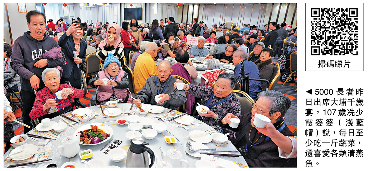 【大公報訊】記者肖泓宇報道:昨日是農曆大年初七「人日」,大埔區第45年舉辦耆老千歲宴,今年逾5000位73歲及以上長者出席,較去年多千人,其中97歲以上長者有50位。最年長的參加者、107歲的冼婆婆年輕時曾經歷過侵華戰爭,新年願望是國泰民安,她分享長壽秘訣,表示自己會多吃蔬菜、日日都要開心過;90歲的葉婆婆自73歲開始便每年都參加千歲宴,「希望大家都身體健康,以後每年都能在千歲宴上見到街坊鄰里」。