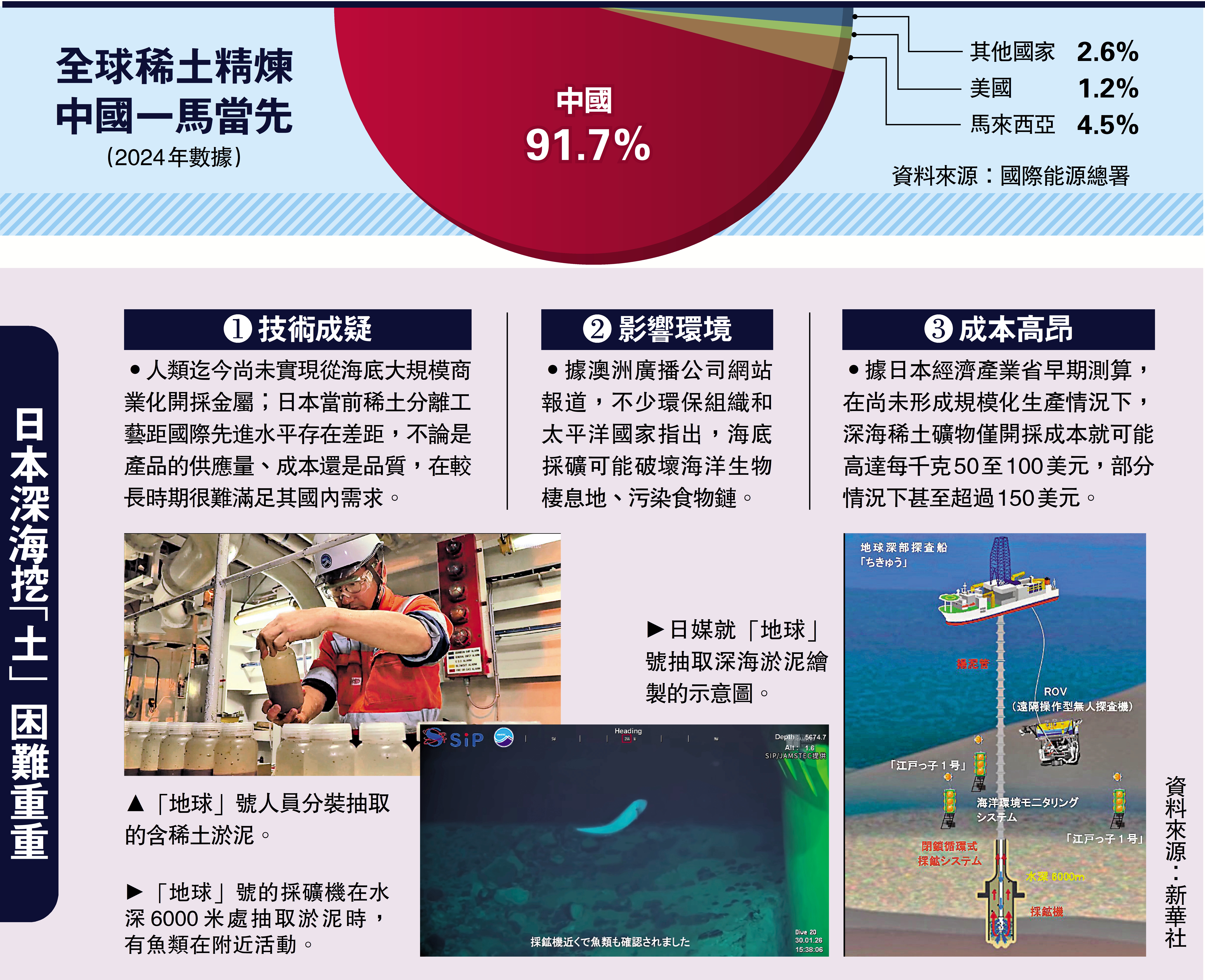 •人類迄今尚未實現從海底大規模商業化開採金屬;日本當前稀土分離工藝距國際先進水平存在差距,不論是產品的供應量、成本還是品質,在較長時期很難滿足其國內需求。
