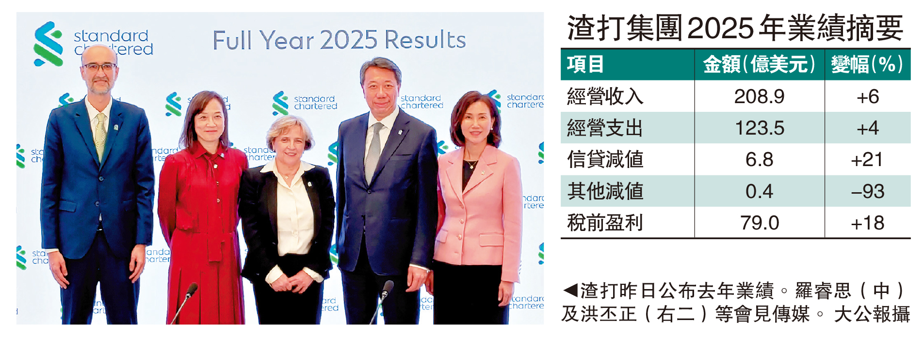 【大公報訊】渣打集團(02888)在2025年的業績表現理想,其RoTE(有形股東權益回報)按基本基準計算達到14.7%,較原定計劃提早一年達成目標之餘,按年更大幅上升300個基點。董事會宣派全年股息每股61美仙,按年大幅增長65%,並推出新一輪總值15億(美元,下同。除非特別註明)的股份回購計劃。
