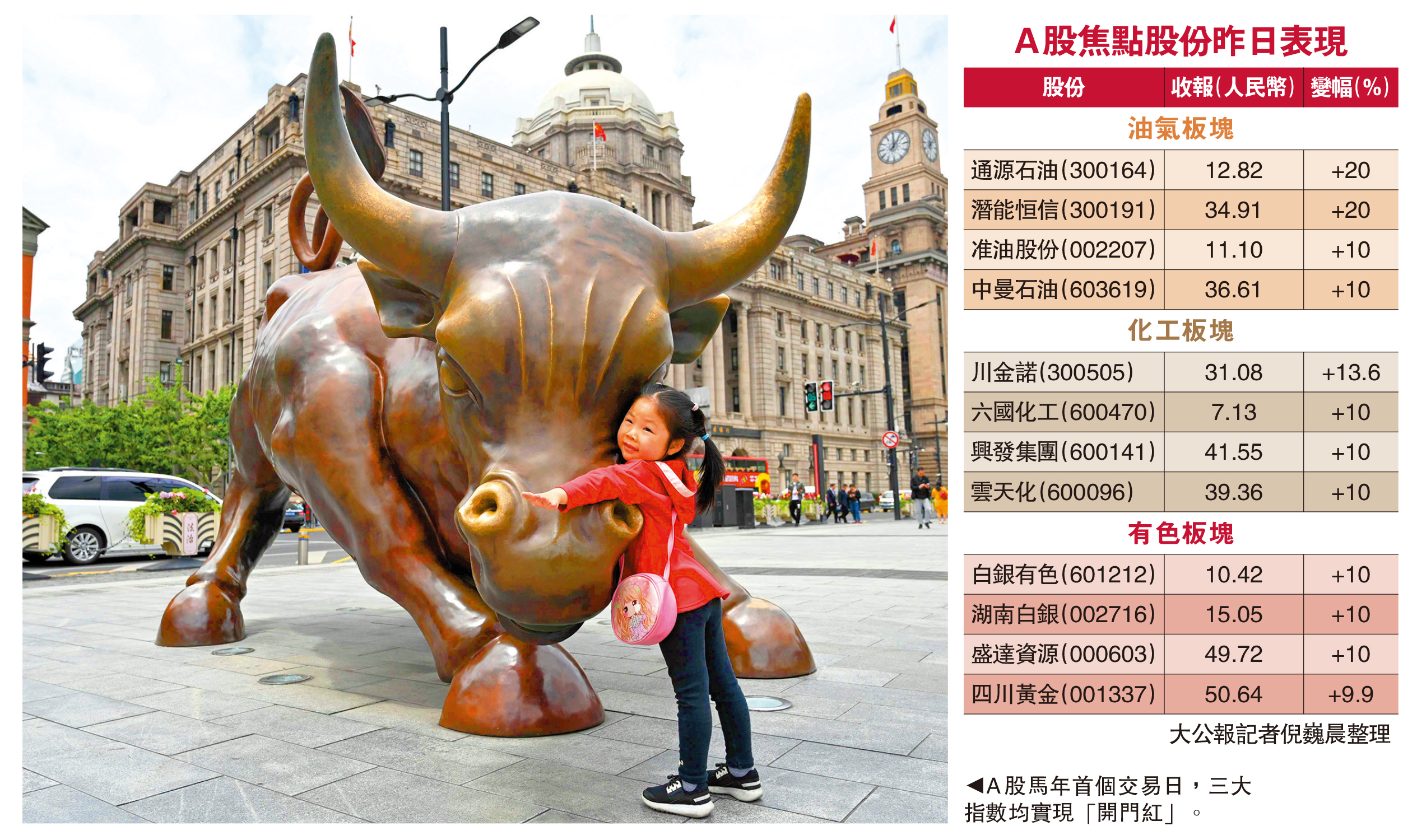 A股馬年首個交易日實現「開門紅」。滬綜指、深成指及創業板指分別收漲0.87%、1.36%及0.99%,收報4117點、14291點及3308點。滬深兩市成交量達2.2萬億元(人民幣,下同),較上一個交易日放量2194億元。分析稱,春節假期外圍市場普遍上漲,特別是港股節後的大幅走高,為A股馬年「開門紅」奠定基礎。部分科技股走強的同時,板塊輪動效應持續增強。總體看,A股春季行情趨勢延續,春節後至4月,市場有望演繹震盪市中的反彈波段行情。\大公報記者 倪巍晨