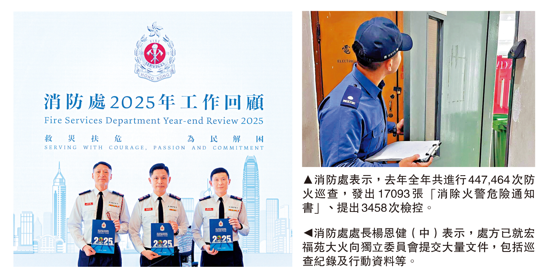 消防處處長楊恩健表示,已就宏福苑大火向獨立委員會提交大量文件,包括巡查紀錄及行動資料。楊恩健續指,將會推進消防相關法例修例,包括將新增條例要求樓宇必須向消防處申請,確保做足防護措施後,方可關閉消防設施。處方亦將推進加強物管公司在消防方面責任,確保消防設施的運作、維修和保養,及監測消防隱患。此外,處方建議加入消防隱患定額罰款條文,增強阻嚇作用。相關法例預計四、五月向立法會報案事務委員會簡介,年內向立法會提交審議。